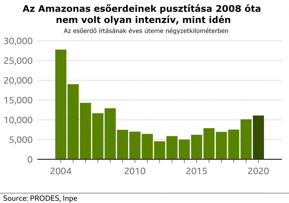 Tavaly augusztus és idén július között 11 088 négyzetkilométer esőerdő veszett oda, ami 9,5 százalékos növekedés az előző évi 7536 négyzetkilométerhez képest. A globális tudományos közösség konszenzusa szerint Jair Bolsonaro vezetése alatt az esőerdők irtása felgyorsult.