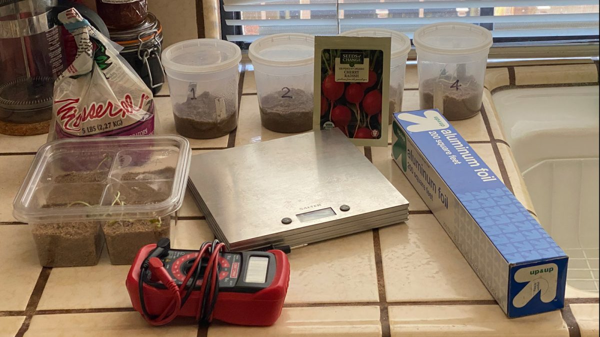 aki időközben a talaj nedvességtartalmát és annak párolgását is mérte, saját kezűleg készített elektródák segítségével: négy-öt rétegű alufólia csíkot hajtogatott, majd egy egyszerű akkumulátor teszterrel megmérte a talaj ellenállását, ami a benne lévő víz mennyiségével arányos.
