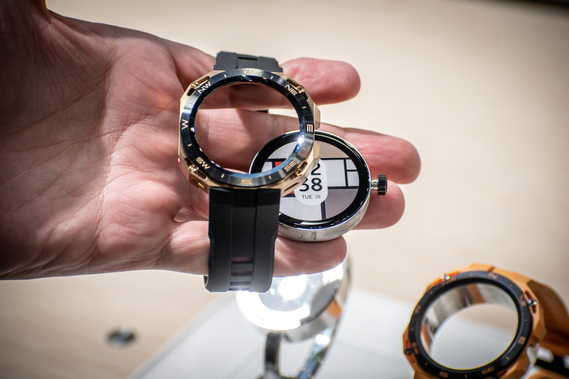 A Barcelonában múlt héten megrendezett Mobil Világkiállításon volt lehetőségünk közelről is megnézni az Európában március 1. óta kapható eszközt, ami kisebb meglepetésre alig vastagabb, mint egy hagyományos okosóra: az 1,43 colos, 466x466 pixeles felbontású AMOLED kijelzőt tartalmazó óra egész pontosan 47x47 milliméteres méretekkel rendelkezik, a vastagsága 15 milliméter, a tömege pedig szíj nélkül 66,5 gramm. Összehasonlításképpen, a tavaly nyáron bemutatott, ugyanekkora kijelzővel ellátott Watch GT 3 Pro ennél négy milliméterrel vékonyabb, igaz, az az óra 12 grammal kevesebbet nyom, de ez az eltérés nagyjából megfelel a fülhallgatók tömegének.