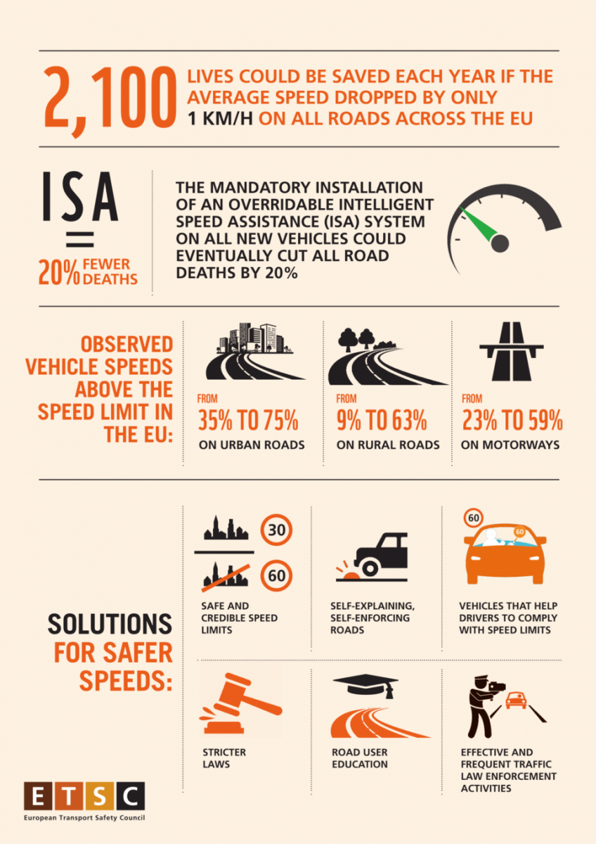 Az Európai Unió közösségi szinten is foglalkozik a sebesség csökkentésével. A legnagyobb visszhangot a német sztrádák korlátozás nélküli szakaszaival kapcsolatban időről időre visszatérő felvetések szokták verni, de van az európai közlekedési stratégák asztalán ennél jóval átfogóbb érvényű tervezet is, benne a közelmúlt nagy port felvert hírével, az automatikus sebességkorlátozás-betartó rendszerek kötelezővé tételéről az új autókban. Úgy tűnik, az európai közúti közlekedéspolitika elsősorban és mindenekelőtt a sebesség csökkentéséről szól.