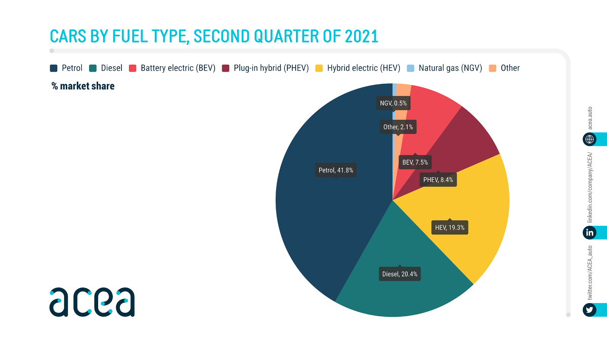 Az Európai Autógyártók Szövetsége (European Automobile Manufacturers’ Association/ACEA) 15 nagy, Európában működő autógyártót képvisel a BMW csoporttól kezdve a Volkswagenen át egész a Volvo csoportig, illetve több gyártó helyi képviseletét, mint a Honda Motor Europe vagy a Toyota Motor Europe. A mostani jelentésük pedig a különböző járművek 2021-es második üzleti negyedévének a piaci részesedését hasonlítja össze a tavalyival. Ezek szerint az új autók értékesítései a következőképp oszlottak meg: tisztán elektromos – 7,5 százalék, hibrid – 19,3 százalék, benzines – 41,8 százalék.