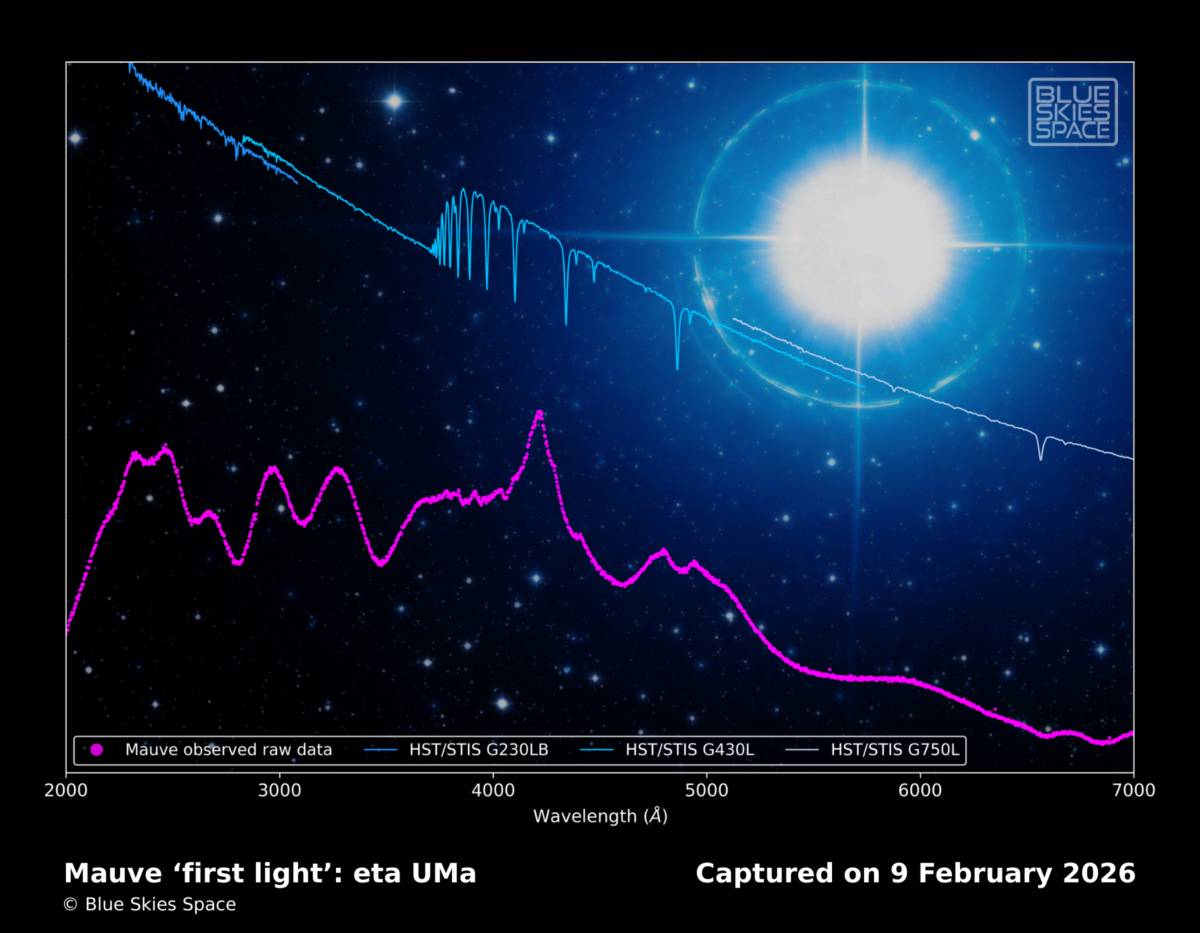 A privát űrteleszkóp apró mérete miatt gyorsabban elkészült, mint a hatalmas, komplex felépítésű társai (például a Hubble vagy a James Webb Űrteleszkóp) és egyszerűbben, olcsóbban lehetett az űrbe küldeni, ezért jó lehetőséget kínál rá, hogy költséghatékony módon növelje a kutatók számára rendelkezésre álló megfigyelési időt. A Mauve a tudományos munkákat hamarosan megkezdi, de az “első fényt” már begyűjtötte: ennek során a Nagy Medve csillagkép egyik legfényesebb csillagát, az Alkaidot (Eta Ursae Majoris) figyelte meg. A Földtől körülbelül 104 fényévre található csillag sokkal forróbb a Napnál, és ultraibolya tartományban intenzíven ragyog, ezért éppen ideális célpontot jelentett a műszerek kalibrációjához a Blue Skies Space leírása szerint.