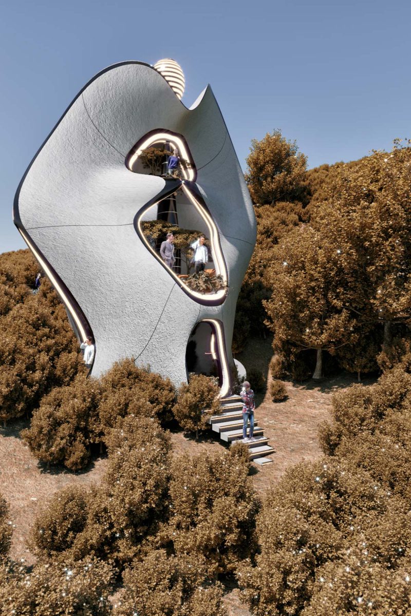 Az építészcég, a Mask Architects elképzelése, hogy egy, a tájba illeszkedő és a természettel egybefonódó struktúrát hozzanak létre, ennek érdekében pedig olyan új technológiát használnak, ami lehetővé teszi az egészen különleges szerkezeti kialakítást is. A 3D nyomtatással készült acélkülsőt, amelyet exoszekeltonnak hívnak a tervezők, olyan formára hajlítják meg, hogy tartani tudja az egész ház súlyát, vagyis átveszi a szerepet a tartóelemektől és a külső borítás válik a szerkezet fő támasztékává.