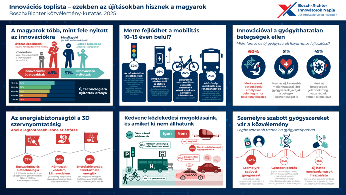 Az idei Innovátorok Napján bemutatták a vállalatok közös kutatását is, amelyben a magyarok véleményét és hozzáállását mérték fel a technológiai trendek megítélésével kapcsolatban. Milyen innovatív megoldásoknak örülnének a magyarok? Hisznek-e az mRNS technológiában vagy a 3D-nyomtatható szervekben? Utaznának-e légitaxival vagy hidrogénvonaton? Az Innovációs toplista: ezekben az újításokban hisznek a magyarok című kutatás ezekre a témákra derített fényt.