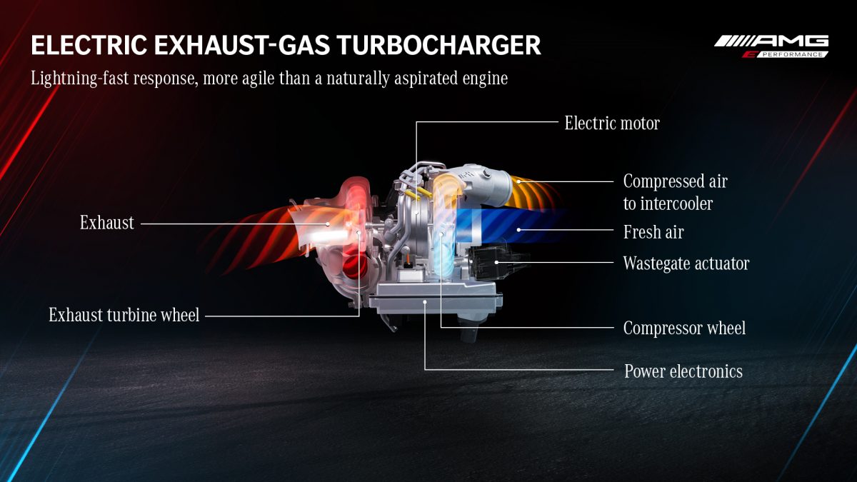 Az AMG villamosításának egyik sajátos mellékszála, hogy a kétliteres benzinmotorhoz terveztek egy elektromos turbófeltöltőt. A villanymotorral pörgetett turbina a klasszikus, a csupán a kipufogógázokkal meghajtott légsűrítőnél gyorsabb reakciókra képes, a turbólyuk ezzel a megoldással teljesen kiküszöbölhető, a gázreakció a szívómotorokénál is gyorsabbra vehető. A turbinatengelyre szerelt, mindössze négy centiméter vastag, 156 ezres percenkénti fordulatszámra képes villanymotor a szívó- és kipfogóldali lapátsorok között a gázpedál állásszögétől kap jelet, melynek hatására felpörgeti a turbót, még mielőtt a megnövekedő kipufogógáz-mennyiség átvenné tőle a munkát. A motor akkor is fenn tudja tartani a töltőnyomást, ha a vezető egy pillanatra elveszi a gázt, így a gyors terhelésváltások között sem esik le az újra elérhető teljesítmény.