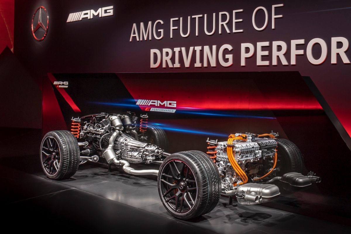 Az AMG hibridrendszere moduláris felépítésű: négy- vagy nyolchengeres belsőégésű motorral egyaránt kombinálható az elektromos hajtómotor és az akkumulátor. A hátsó kereket hajtó villanymotor a hibrid AMG-ben 150 kW-tal, 320 Nm-rel segíthet be a hagyományos motornak. A nagy elérhető sebességek érdekében az AMG villanymotorja kétfokozatú sebességváltót is kap, amelyből a nagyobb vezetési élményért részlegesen önzáró differenciálművön keresztül jut a hátsó kerekekre a teljesítmény. A második fokozatot 140 km/h-nál kapcsolja a váltó, amikor első fokozatban a villanymotor fordulatszáma eléri a maximális, 13500-as percenkénti tervezési fordulatszámot.