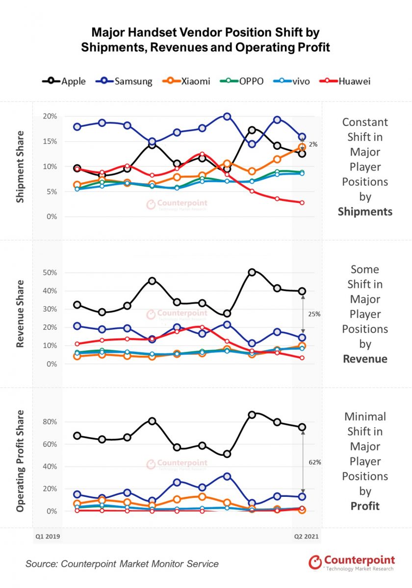 A Counterpoint Research szerint míg az Apple az eladott telefonok darabszámát tekintve 2021 második negyedévében csupán a harmadik volt a Samsung és a Xiaomi mögött a maga 13 százalékos részesedésével, a bevételek 40 százalékát így is ők tették zsebre, a nyereséget illetően pedig az előnyük egészen letaglózó: 75 százalék, ami pontosan 62 százalékkal több, mint a második helyezett Samsungé.
