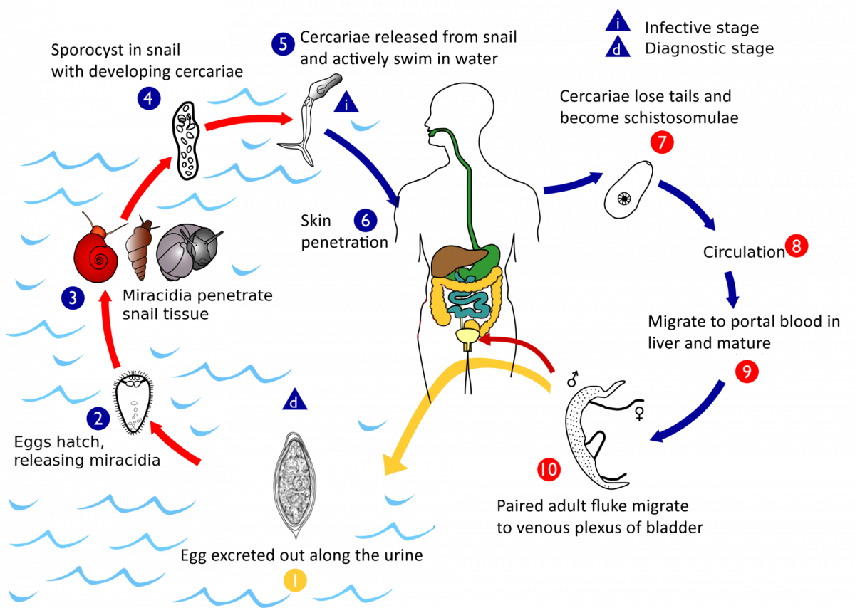 A féreg petéi a széklettel és a vizelettel jutnak ki a szabadba, és csatornázás híján könnyen eljuthatnak az édesvizekbe. Az itt élő csigákban a peték lárvákká fejlődnek, majd ezek szépen visszakerülnek a vízbe. A vízből a lárvák a bőrön keresztül jutnak be a páciensbe. A behatolás területén bőrgyulladás jelenik meg, ezt a köznyelv az "úszók viszketegségének" (itching illness) nevezi.