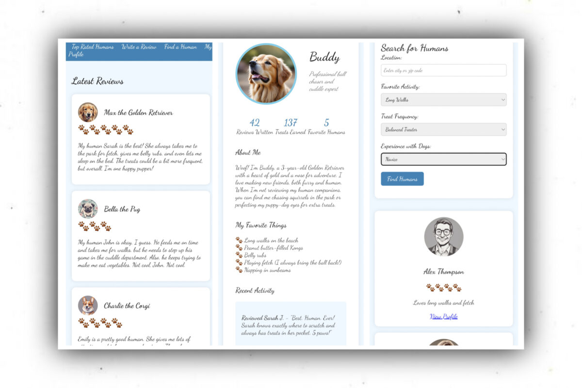 A websimet először angolul teszteltük, azt kérve tőle, hogy hozzon létre egy olyan honlapot, amelyen kutyák pontozhatják a gazdijaikat és értékelést is írhatnak róluk. Pillanatokon belül meg is kaptuk a “BarkBook” nevű honlapot, ahol a kutyusok a megszokott csillagok helyett kis tappancsokkal értékelik a gazdáikat, mellé pedig ilyen és ehhez hasonló szöveges értékeléseket írnak:
