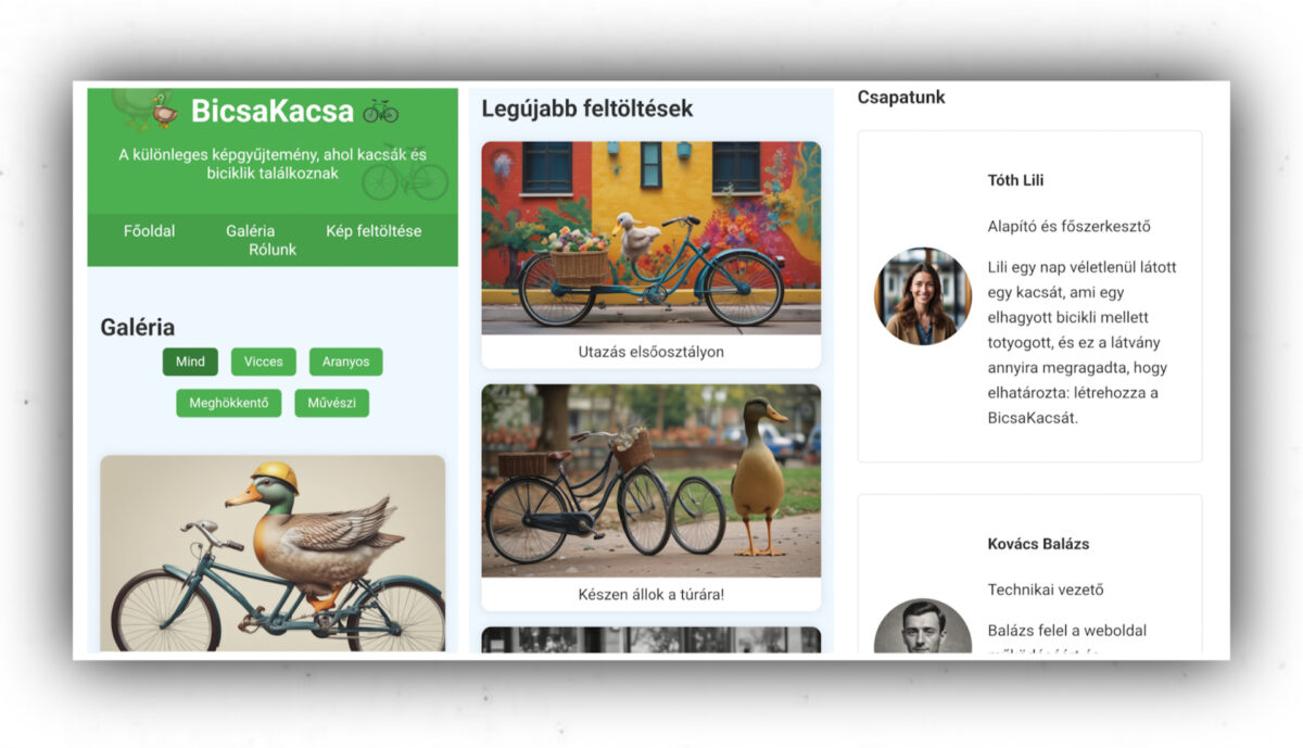 Ami rögtön feltűnik, hogy mivel a Claude magyarul kapta a parancsot, ezért rögtön magyar nyelvű honlapot is alkotott “Bicsakacsa” néven, amelyen a kérésünknek megfelelően valóban csak olyan képek szerepelnek, amelyeken van kacsa és bicikli is. Ez persze nem meglepő, hiszen magukat a képeket is a mesterséges intelligencia generálta a honlaphoz, mégpedig egészen kiváló minőségben.