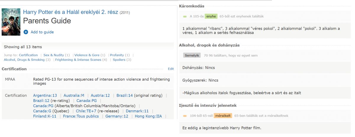 Az IMDB-t legtöbben arra használják, hogy egy-egy film, sorozat értékeléseit megnézzék, visszakeressék miben játszott egy színész, vagy epizódlistákat böngésszenek egy-egy híres jelenetet keresve. Pedig az IMDB Parents Guide oldala tökéletesen alkalmas arra, hogy anélkül, hogy filmek tömegeit kelljen megnéznünk, hozzávetőleges képet kapjunk arról, mi vár gyerekünkre, ha az adott mozit vagy sorozatot megnézi. Káromkodások, felkavaró jelenetek, alkohol, drog – semmi nem kerüli el a szülők figyelmét, ha egy-egy filmet kell gyerekszemmel értékelni.