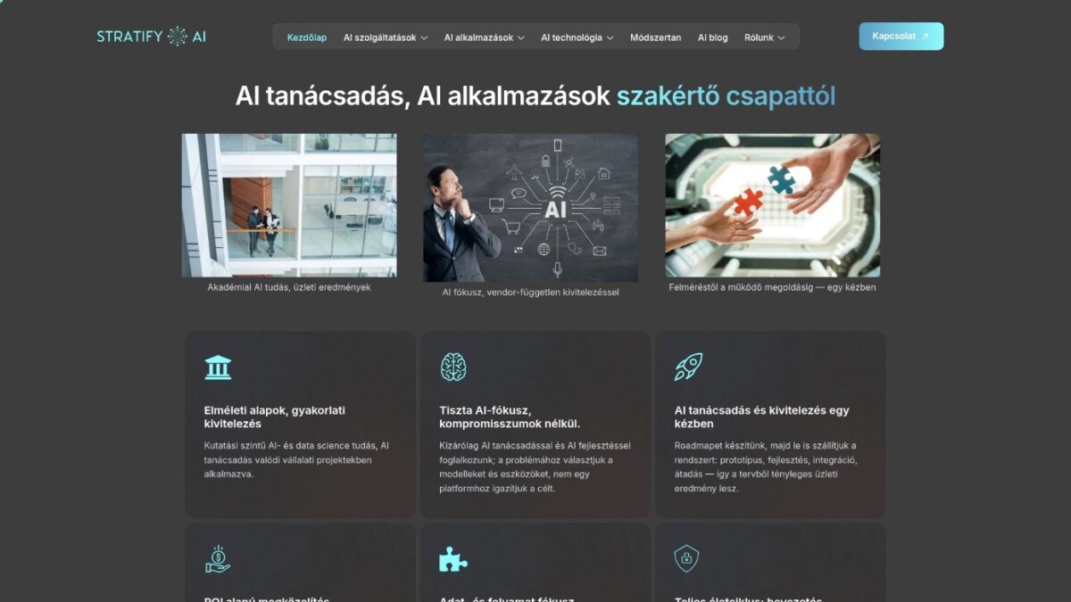 Ne várjon tovább a jövő technológiájával jelentkező versenyelőny megszerzésével A Stratify komplex AI tanácsadással, egyedi fejlesztésekkel és zökkenőmentes integrációval segít abban, hogy a mesterséges intelligencia ne terhet jelentsen hanem katalizátora legyen vállalata fejlődésének Lépjen kapcsolatba velünk még ma és kezdjük el közösen megtervezni vállalata digitális átalakulását az adatok és az AI erejével az Ön oldalán álló szakértő partnerrel akiben megbízhat.