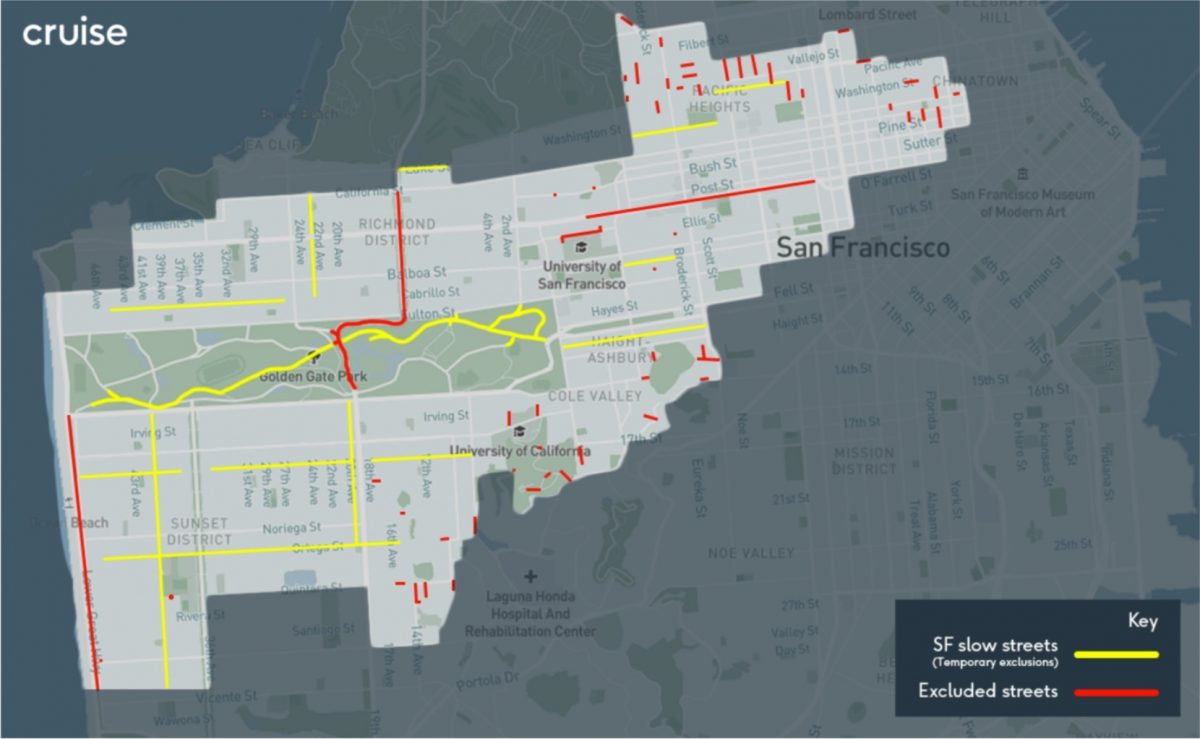 A Kaliforniai Közüzemi Bizottság (CPUP) által kiállított engedély egyelőre számos feltételt szab a vállalatnak arra, hogy mikor és hogyan üzemeltethetik a vezető nélküli taxikat. Ilyen feltétel például, hogy a Cruise harminc (itthon Opel Ampera-e-ként forgalmazott) Chevrolet Boltból álló flottája csak este 10 és reggel 6 között szállíthat utasokat, nem léphetik át a 48 km/h-s sebességet és csak a város bizonyos részein közlekedhetnek. A szolgáltatás nem vehető igénybe hevesebb eső, köd, füst, jégeső, havaseső és hóesés idején és egyelőre arra sincs lehetőség, hogy az USA-ban rendkívül népszerűnek számító utazásmegosztással egyszerre több, egymástól független megrendelő utazzon egy autóval egy hosszabb-rövidebb szakaszon.