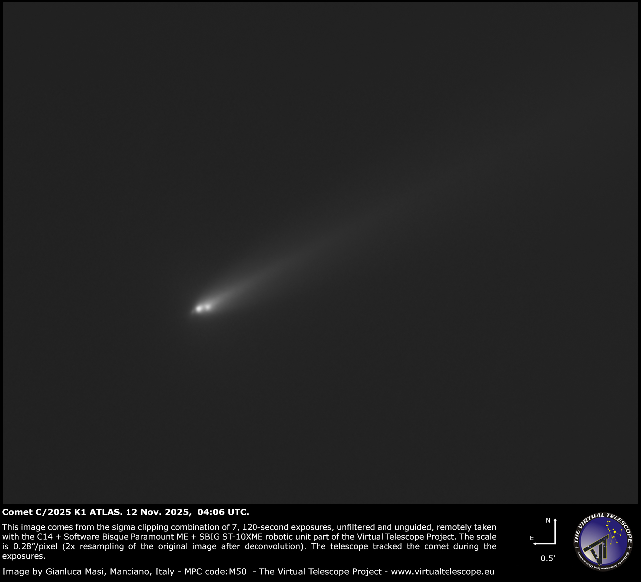 Most kivételesen nem a 3I/ATLAS, hanem egy másik, szintén az ATLAS (Asteroid Terrestrial-impact Last Alert System) rendszerrel felfedezett üstökös, a C/2025 K1 ATLAS került a megfigyelőeszközök fókuszába - az olasz Virtual Telescope Project szerzett róla felvételeket a Celestron C14+Paramount ME+SBIG ST-10XME teleszkóppal november 10-én és 11-én.