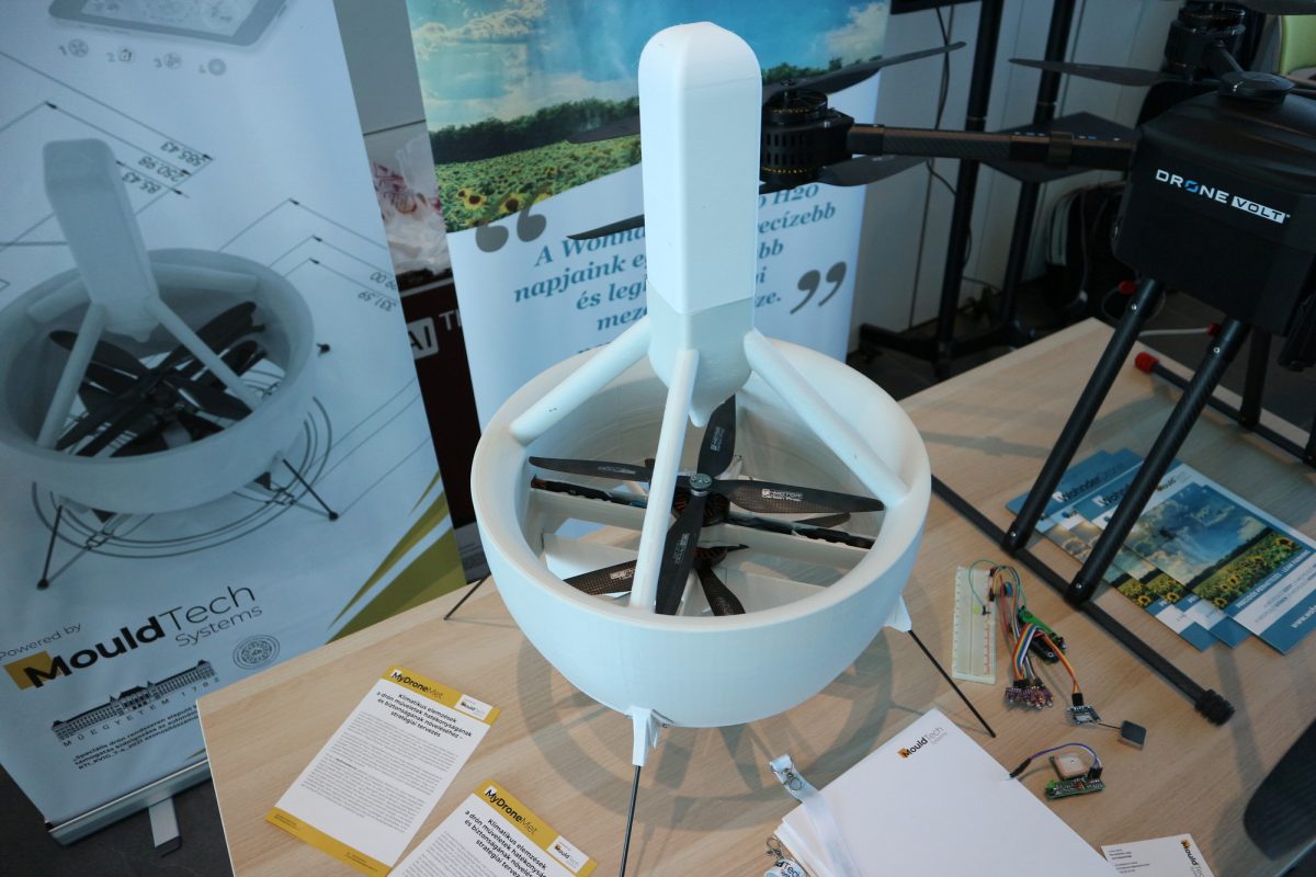 És most valami egészen más: a mezőgazdasági permeteződrón. A zalaegerszegi MouldTech projektjében fejlesztett gép egy izmos, húszkilós teherbírású Hercules 20 ipari drónra szerelt precíziós szóróberendezés. A gép legnagyobb előnye, hogy a sorokat, növényeket célzottan, pontosan beszórni képes technika nagyságrendeket tud csökkenteni a szükséges vegyszer mennyiségén. A MouldTech által közölt adat pontos paraméterek híján persze egy kicsit a levegőben lóg, de akkor is remekül hangzik, hogy a gép nyolcliteres tartálya a különlegesen precíz szórófejekkel akár két köbméternyi, traktorral kijuttatott vegyszer hatását képes produkálni.