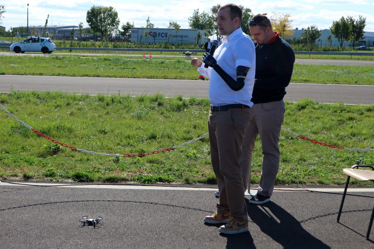 És megint valami egészen más. A Széchenyi István egyetem két, drónokkal kapcsolatos kutatási programját is bemutatta. Ezek közül a BMW-s driftövetés után már kevésbé volt érdekes, amikor egy LIDAR-okkal telepakolt, alacsonyan repülő drón egy kereszteződésben nem ment neki egy autónak, mert észlelte, hogy ott van. Érdekes volt viszont az ötlet, mely alapján cipőbe épített kontrollerekkel működő drónirányító rendszert fejlesztenek. Hogy erre miért lehet szükség? A választ részben megadta, hogy a bemutatót egy végtaghiányos kutató tartotta: