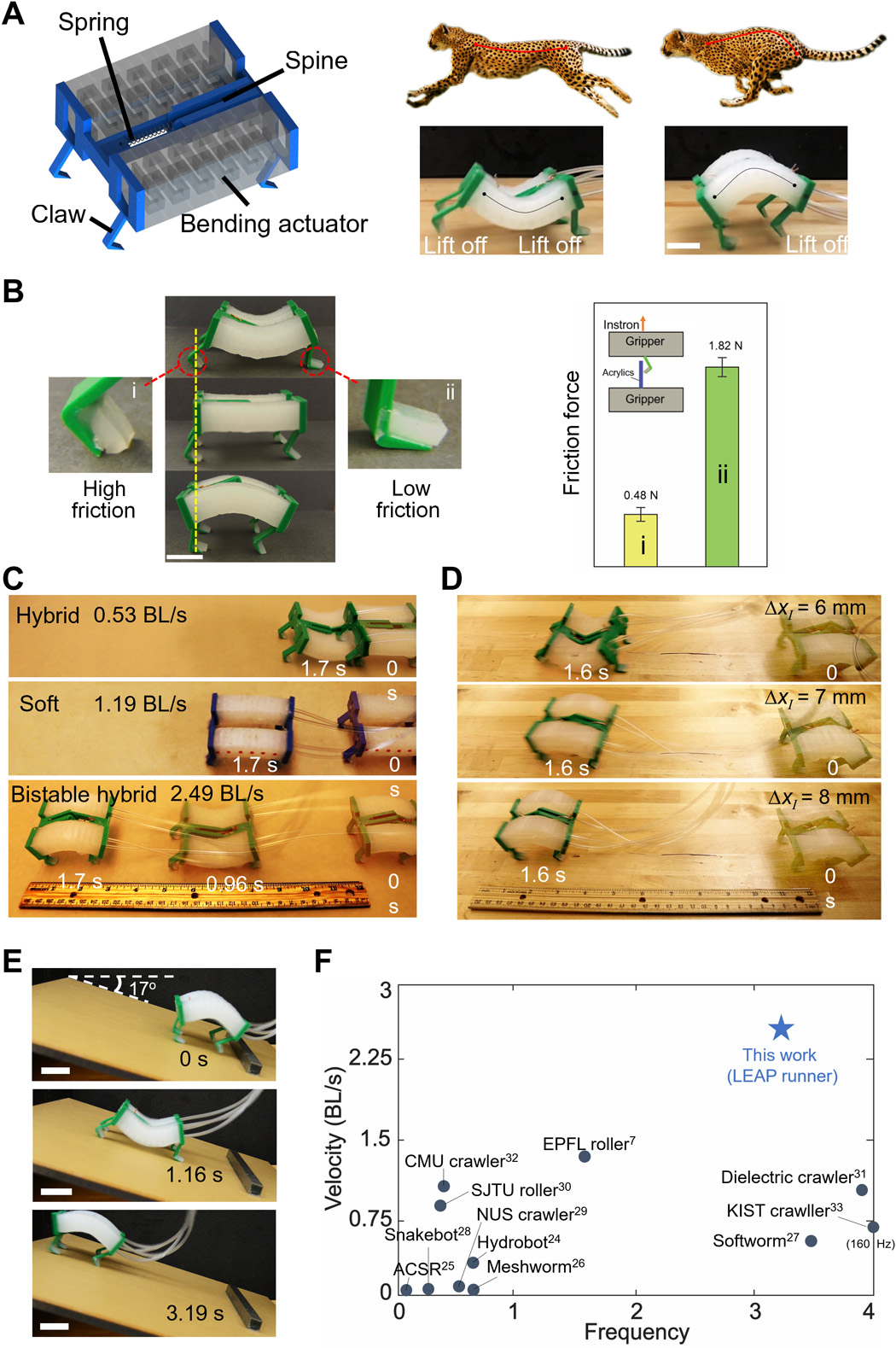 A lágyrobotoknak ez az új osztálya, amelyet “Leveraging Elastic instabilities for Amplified Performance”-nak (kb. rugalmassági instabilitás használata a teljesítmény növeléséért - LEAP) hívnak, alacsony, kb. 3 Hz működési frekvencián, másodpercenként akár 2,7 tized testhossz per másodperc haladási sebességet is képes elérni, ami több mint háromszor gyorsabb, mint az előző generáció sebessége. Ezek az új robotok meredek lejtőkön is képesek felfelé futni, ami kihívást jelenthet vagy egyenesen lehetetlen olyan lágyrobotok számára, amelyek kevesebb erőt képesek kifejteni a talajjal szemben."