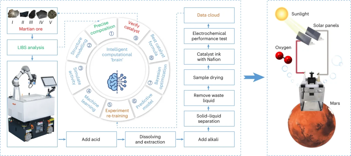 Egy bonyolultabb, de szintén használható módszert a Kínai Tudományos és Műszaki Egyetem kutatói mutattak be a Nature Synthesisben megjelent tanulmányukban: az ő megoldásuk robotizált módon készít katalizátort, amellyel vízbontással oxigén állítható elő. Az automata laboratórium egy robotkarral végzi a munkát, amelynek során marsi ásványokból nyeri ki a katalizátorhoz szükséges anyagokat, miután savban feloldotta, előkészítette és elemezte az összetevőket. A teszt alatt marsi meteoritokat használtak a kutatók annak felmérésére, hogy képes-e a robot a bolygón található kőzetekből katalizátort készíteni. A gép sikerrel járt, a működésének egyik nagy előnyét pedig az adja, hogy a teljes folyamatot emberi beavatkozás nélkül, mesterséges intelligencia segítségével tudja elvégezni.