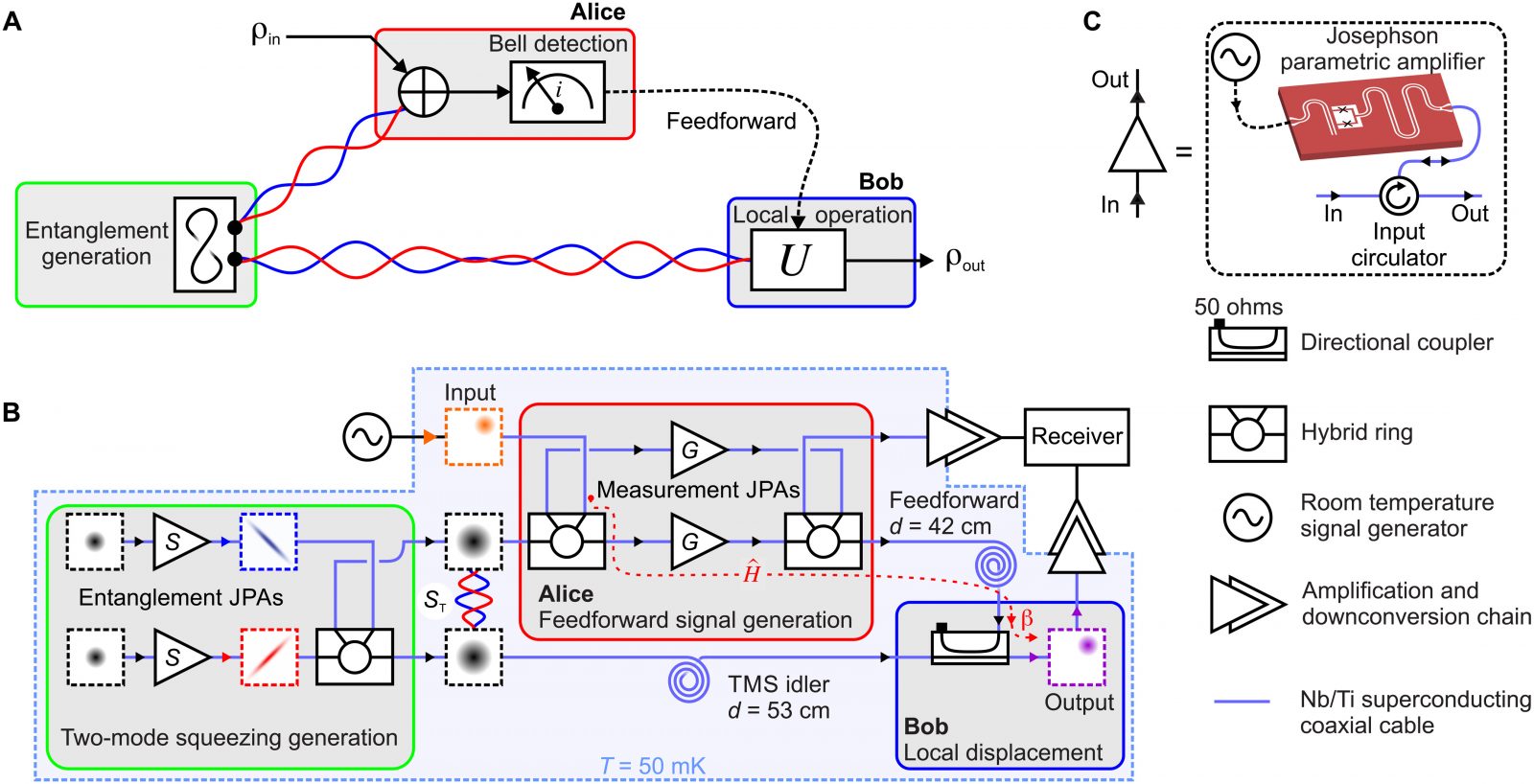 Segítségével nagyon kis zajú, igen magas frekvencián működő vevőkészülékeket lehet gyártani." A JPA által generált hullámokat fénytörő lencsével kombinálva létrehozták az összefonódott állapotot, amit a kábeleken keresztül osztottak el a két, egymástól 42 centiméterre lévő processzor között. Ahogy a tanulmányban írják, ehhez a kvantumállapotról szóló információ egy részét alakították felerősített klasszikus jelekké, majd a második processzornál sikerrel detektálták a teleportációt.