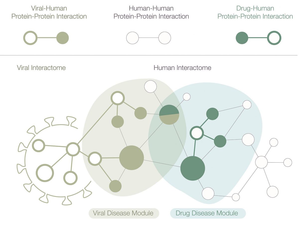A hálózati orvoslás megközelítése a vírusfehérje-emberi fehérje és a gyógyszer hatóanyagok-emberi fehérje kölcsönhatásokat térképezi fel, az emberi interaktómában (fehérje-fehérje kölcsönhatások), hogy azonosítsák azokat a gyógyszereket, amelyek megzavarják a COVID-19 betegségmodul környezetét.
