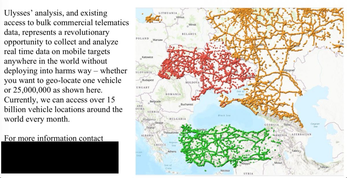 Arról, hogy egészen pontosan kiktől szerzik és hogyan adják tovább a tudásukat, a vállalat komikusan ügyetlen weboldala természetesen semmit sem árul el. Azt viszont a Motherboard birtokába jutott prezentációban láthatjuk, ahogy keleti szomszédainknál megjelenítik - állítólag - huszonöt millió autó helyzetét. Ráadásul úgy számolnak, hogy 2025-re minden új autóban lesz adatkapcsolat, vagyis megfigyelhetővé válik. A cég ígéreteire nem érdemes legyinteni: Cox azt is kiderítette, hogy a Ulysses korábban már dolgozott az Egyesült Államok Különleges Műveleti Parancsnokságának (U.S. Special Operations Command, SOCOM). Akkor Afrikában és Ázsiában vizsgálták, hogy Amerika versenytársai milyen befektetéseket hajtottak végre. A LinkedIn oldalukon is hirdetik, hogy a telematika alapú hírszerzés "az adat következő forradalma".