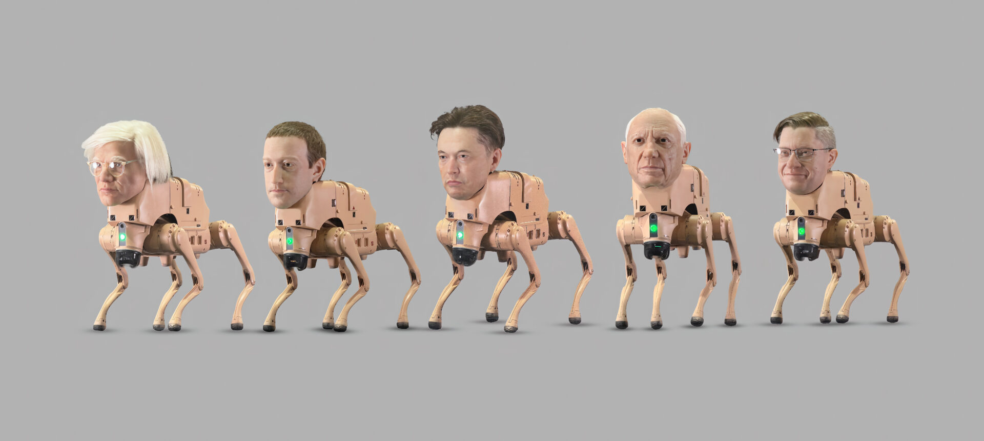 Egy amerikai kiállításon a szokásostól határozottan eltérő külsejű robotkutyák jelentek meg, amelyek valószínűleg a legbizarrabb robotk közé tartoznak, amiket valaha készítettek. A négylábú gépek testére ugyanis fejeket illesztettek, méghozzá nem akármilyen fejeket, hanem híres üzletemberek és művészek arcának másait. A robotkutyák között felbukkant Elon Musk, Jeff Bezos, Mark Zuckerberg robotizált verziója, valamint Andy Warhol és Pablo Picasso is, emellett pedig maga az ötletadó művész, Mike Winkelmann.