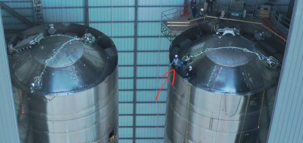 A Starship két részből, két fokozatból áll majd, és mindkettő többször felhasználható. Az első fokozat, maga a rakéta, a Super Heavy, amely segít kitörni az űrhajónak a Föld gravitációs vonzásából. Ennek a rozsdamentes acélból készült tartályai láthatóak a képen. Az egyik Twitter-felhasználó nagyításán pedig egyértelműen látszódnak a tartályok tetején tevékenykedő technikusok.