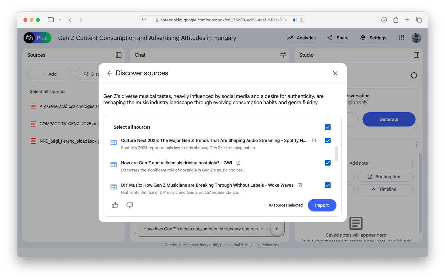 A The Verge számolt be arról, hogy az új "Discover" ("felfedez") funkció segítségével a területhez kapcsolódó webes források százait pörgeti át a NotebookLM, majd kiválasztja a tíz legrelevánsabbat, és azokat rövid, szöveges bemutatókkal látja el. Csak bepipáljuk, hogy melyiket szeretnénk a kutatási forrásanyagaink közé emelni, és meg is vagyunk.