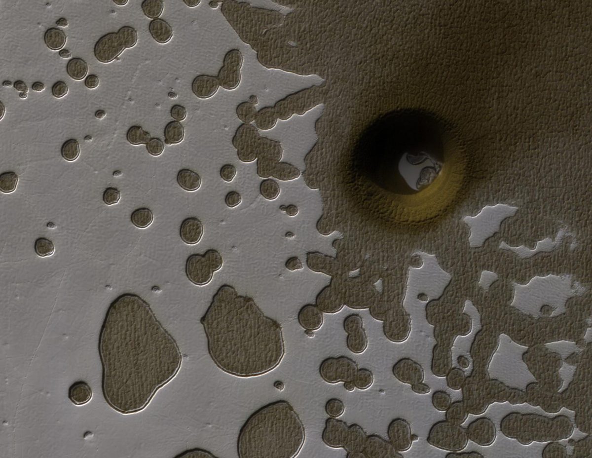 A fent látható, „svájci sajt” elnevezésű régióban számtalan hasonló kerekded gödör keletkezik a jég szublimációja miatt, egyes felvételeken pedig érzékelhetőek is ezek a mélyedések. A Mars vörös felszínén fehér árnyalatú fagyott szárazjég rakódott le, ezért látványosak a mennyiségében bekövetkezett változások, és akár egy éven belül, akár hosszú távon alkalmasak arra, hogy segítségükkel jobban átlássuk a marsi folyamatokat. A mosolygó krátert szintén ez a jég tölti ki, ám egyes helyeken szublimált belőle, ennek hatására rajzolódott ki az arcra emlékeztető mintázat. A felszíni jég mennyiségének változásai miatt a kráter mosolya is változik. A fotókon jól látszik, hogy a korábban két gödörből álló orr egybeforrt, ahogy a mosolygó száj szélesebbé vált, miután összenőtt egy korábban különálló gödörrel. Ugyanilyen változásokat láthatunk a szemeken, vagy a homlok egyes részein. A fenti különbségek mégis akkor a leglátványosabbak, ha a 2007-ben készült felvétellel vetjük össze az aktuálisat: