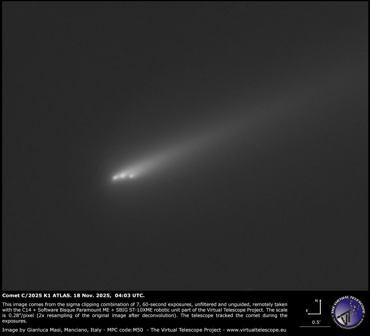 És még egy fotó a C/2025 K1 ATLAS-ról a The Virtual Telescope Projecttől. A másik ATLAS szinte űrbeli járműnek tűnik a képeken. (Fotó: Gianluca Masi)