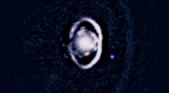 A WISPIT-2 rendszer a Magellan és a Large Binocular Telescope felvételén; a jobb oldali kék „paca” maga az exobolygó. (Forrás: Laird Close, University of Arizona)