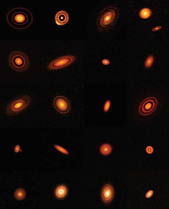 ALMA által készített felvételeken látható protoplanetáris korongok válogatása. (Forrás: ALMA (ESO/NAOJ/NRAO), S. Andrews és munkatársai; NRAO/AUI/NSF, S. Dagnello)
