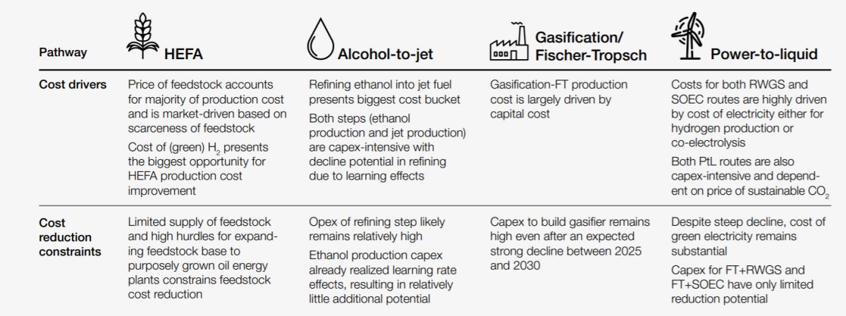 Ezek az üzemanyag-típusok jól implementálhatók a meglévő repülési infrastruktúrába, de hogy pontosan melyiké a jövő, nehéz megmondani. A gyártási költségek, a gyártáshoz szükséges beruházások mértéke és megtérülése a WEF-jelentés szerint nagyon különböző, ugyanakkor egyes régiókban egyes energiahordozók előállítására alkalmasabb adottságokat találhatunk.