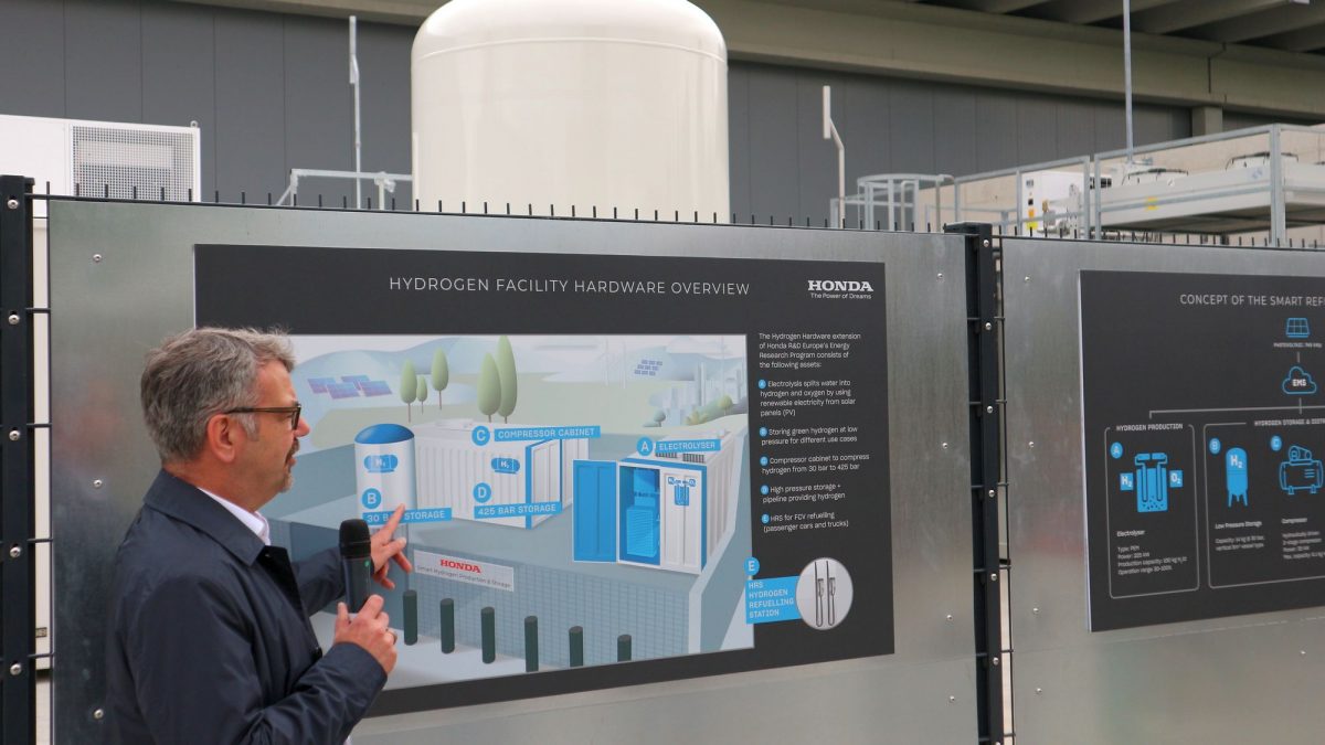 A Honda három új autó és egy elektromos kismotor bemutatójának betétprogramjaként megmutatta az autós szaksajtónak, hogyan integrált Frankfurt melletti európai kutató-fejlesztő komplexumába az autózással, közlekedéssel összekapcsolódó energetikai megoldásokat. A látványosabb projekt egy zöldhidrogén-termelő rendszer telepítése, mely az Offenbach nevű városkában lévő Honda R&D Europe egyik sarkában készül. A konténerbe zárt elektrolizáló az épületet és a kocsibeállítókat fedő napelemeknek (összesen 749 kW csúcsteljesítmény) az üzemegység fogyasztását meghaladó többletenergiájával víz bontásával állít elő hidrogént, azt egy kompresszor tartályokba sűríti, majd a dolgozók egy kútoszlopról a cég Clarity hidrogénautóiba tankolhatják.