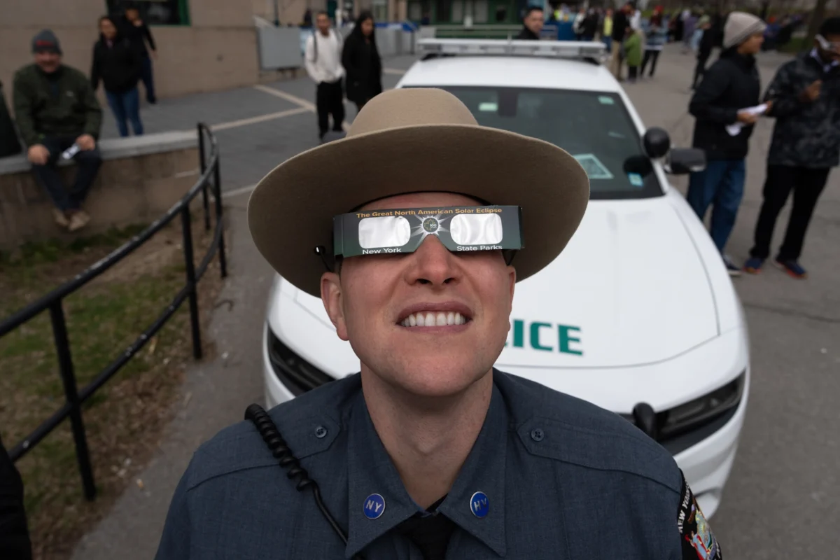 Bár New Yorkban nem volt teljes a napfogyatkozás, így is rengeteg ember gyűlt össze az utcákon és a felhőkarcolók tetején, hogy a saját szemükkel lássák a ritka égi jelenséget (Fotó: John Lamparski/Getty Images) A napfogyatkozásnak köszönhetően távcsővel is jól megfigyelhető volt a Nap koronája (Fotó: Peter Zay/Anadolu via Getty Images) A vermonti Carmi-tó környékéről így nézett ki a hétfői napfogyatkozás (Fotó: Noam Galai/Getty Images) A Niagaránál kicsit ugyan felhős volt az ég, de ettől csak még látványosabb lett a műsor (Fotó: Vaughn Ridley/Getty Images) New York állam parkőrségének az egyik tagja nézi a napfogyatkozást a Niagara-vízesésnél (Fotó: Adam Gray/Getty Images)
