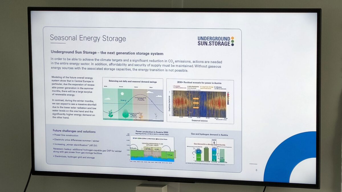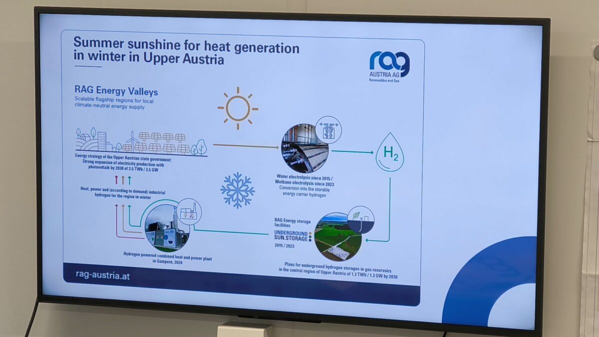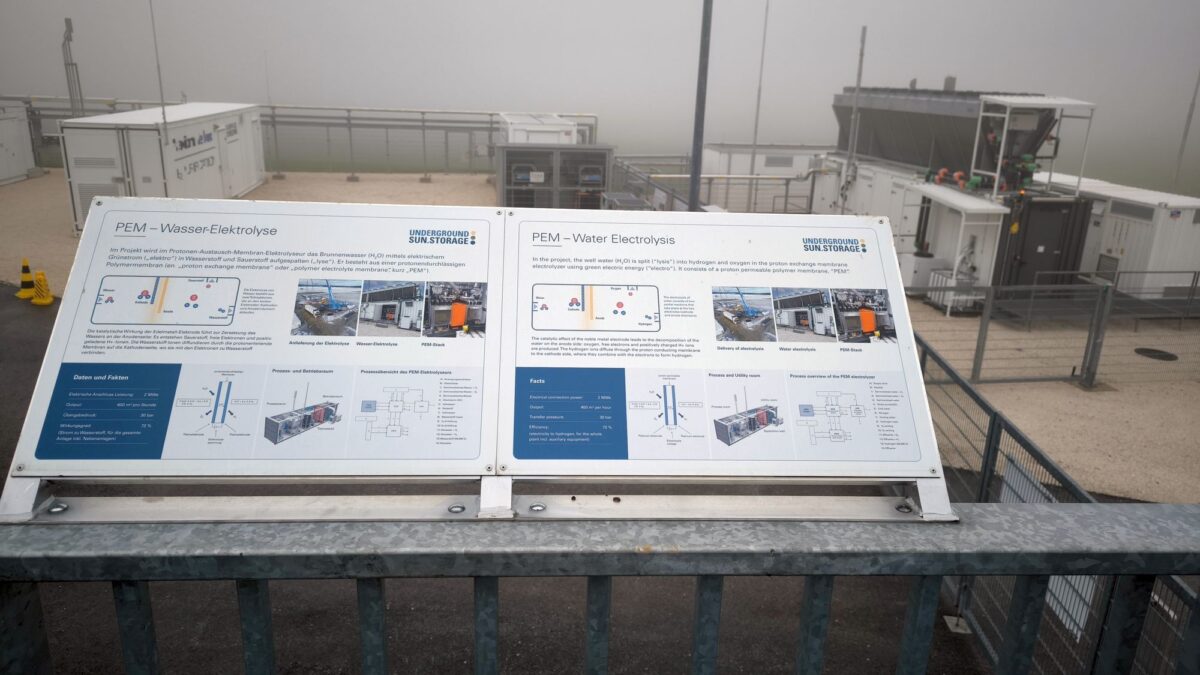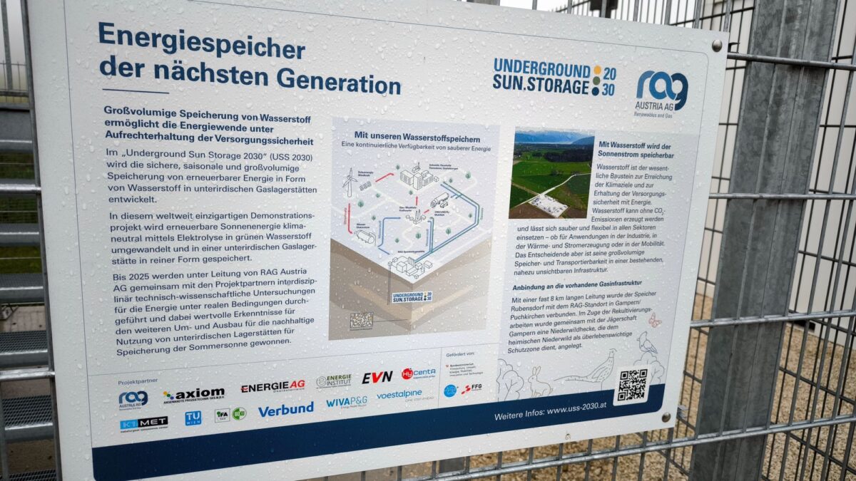 A vállalat a felső-ausztriai Berg im Attergau városka melletti mezőgazdasági területen, két éves kivitelezés követően tavaly áprilisban üzemelte be az ország első komolyabb, már gazdaságilag értelmezhető, de azért még mindig csak mintaprojekt nagyságrendű hidrogénelőállító- és tároló üzemét. Az "Underground Sun Storage" (Földalatti Naptározó) fantázianevű telephelyen a tárolási folyamat első lépcsőjében egy 2 megawatt teljesítményű elektrolizáló bontja a lakosági vízhálózatból érkező, de klórozatlan vizet. Az ehhez használt elektromos áram elszámolás tekintetében az osztrák naperőművek termeléséből származik, a napsütéses hónapokban évi 4,2 GWh energia "alakul át" hidrogénné. Ez nem kevés, de egy ország energiaigényéhez képes nem is sok: a mi paksi erőművünk valamivel több mint két napi teljesítményének felel meg. A vízbontás hatásfoka 72%-os, ami nyilván komoly veszteség ahhoz képest, mintha azonnal felhasználnánk a zöldáramot, de hát a projekt lényege épp az, hogy amit nem használunk fel, annak egy részét eltegyük, eltehessük későbbre.