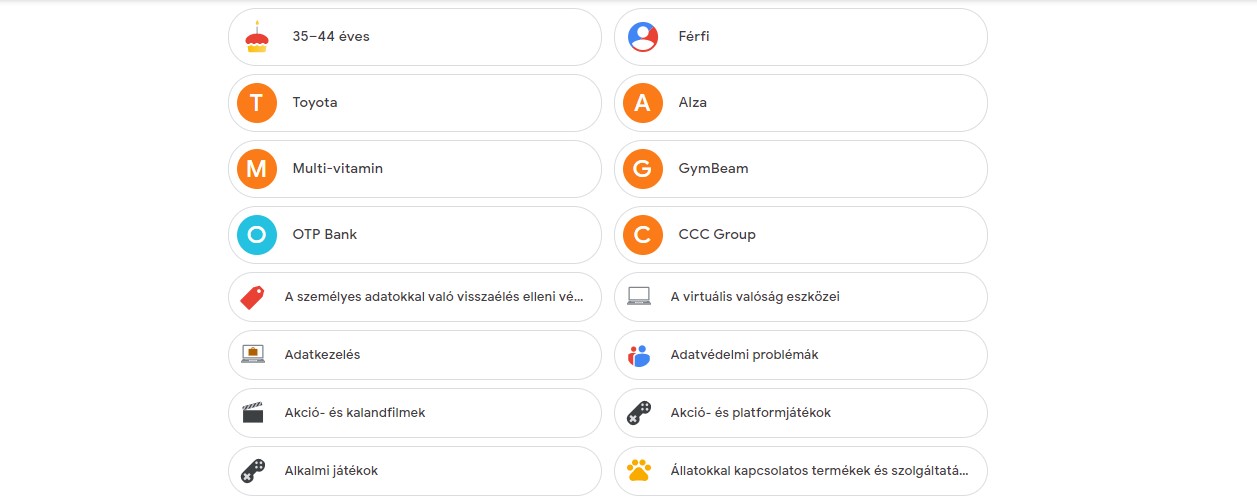 Nem igaz azonban, hogy a Google az adatgyűjtést titokban végezné, sőt erre felhatalmazást kell adnunk a célzott hirdetések beállításánál. Ezen a weboldalon ellenőrizhetjük, hogy a célzott hirdetések be van-e nálunk kapcsolva. Szintén itt, a Google Hirdetésbeállítások oldalon ellenőrizhetjük, hogy milyen profilt állított rólunk össze a Google. Példának itt egy részlet az én profilomból.