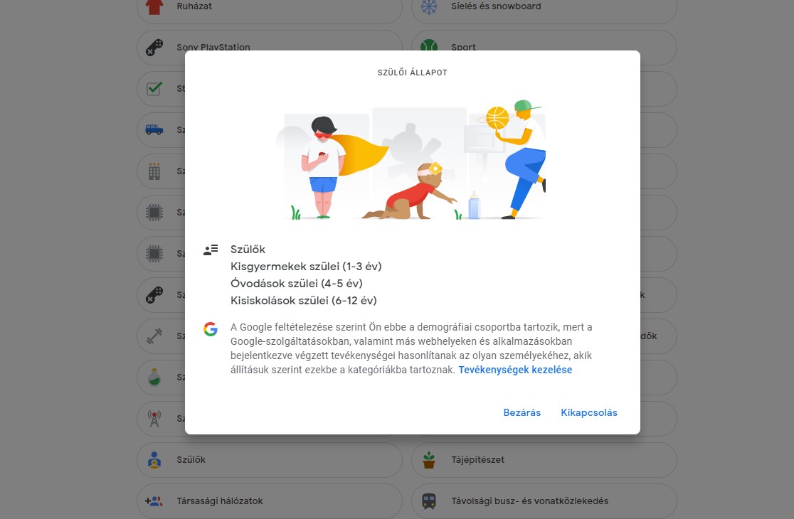 Esetemben a Google-nek nincs könnyű dolga, hiszen a feleségemmel ugyanazt a fiókot használjuk, igaz, a munkám miatt én messze többet guglizok, mint ő. Ennek megfelelően a hálózat elég jól eltalálta mind az életkorom, mind a nemem. Sőt az adatokból még azt a következtetést is levonta a hálózat, hogy házas vagyok, viszont szakmai ágazatnak a technológiai ipart sütötte ki a részemre, ami a rakétás keresések miatt érthető, de azért még ez a jellegű újságírás is inkább média lenne szerintem. Nem mondom, attól kicsit lúdbőrözni kezdett azért a hátam, hogy a Google mennyire jól eltalálta a gyerekeim életkorait.
