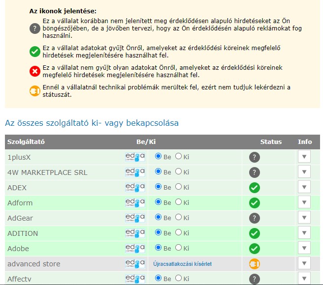Érdekes lehet még ez az oldal, ahol azokat a vállalatokat sorolják fel, amelyek különböző webhelyek szolgáltatójaként adatokat gyűjtenek és dolgoznak fel az érdeklődésen alapuló hirdetések biztosításához. Az ikonok jelentése a képen látható, és itt akár vállalatonként szabályozhatjuk az adatgyűjtést (a be- és kikapcsolásnál állíthatjuk ezt be). Az info gombnál pedig részletesebb információt kapunk az adott vállalatról.