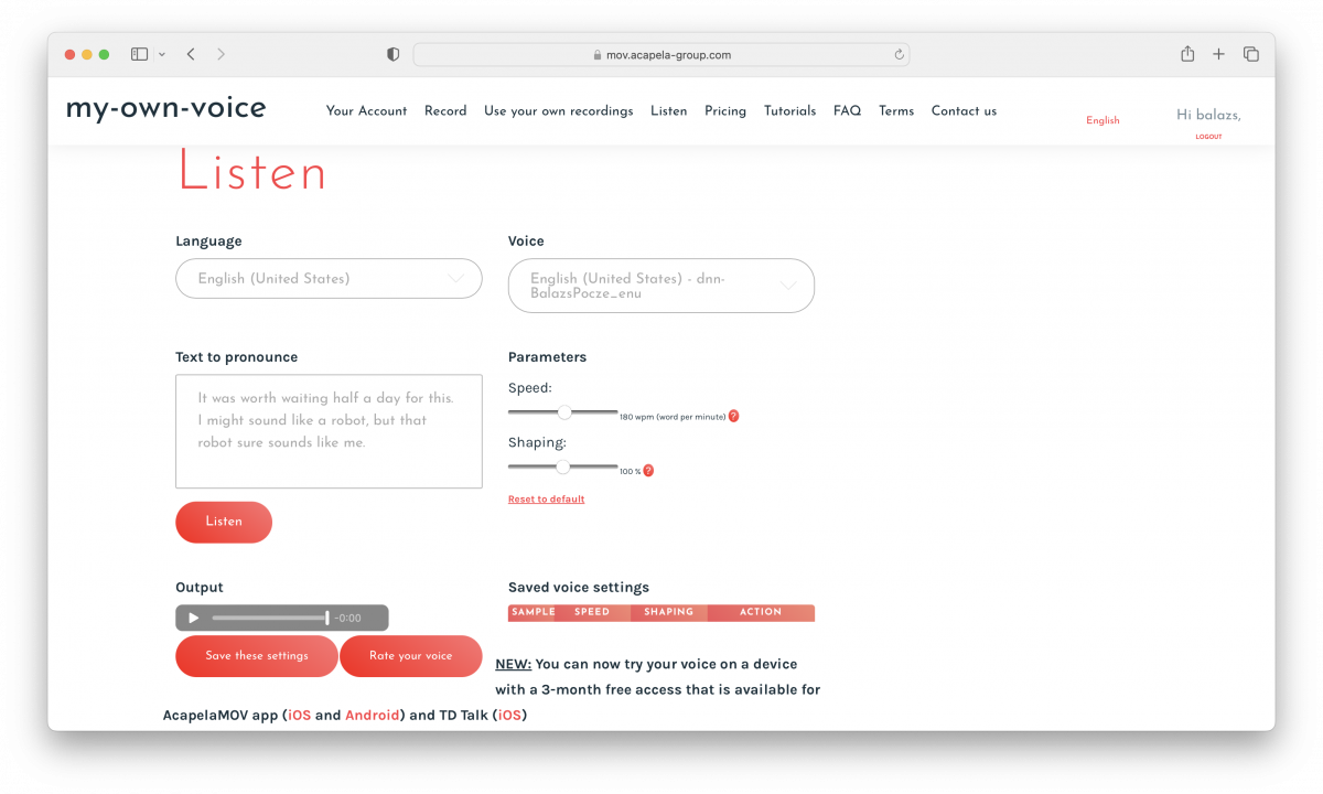 Mi is kipróbáltuk a My own voice-t, és ugyan a folyamat nem teljesen magától értetődő, de a kisebb akadályokat könnyen meg lehet ugrani. Ilyen például az, hogy a regisztrációk jóváhagyása még kézzel történik, így némi időt vesz igénybe, vagy hogy a felvételek kezelőfelülete helyenként akadozik. A szoftver valamivel több mint húsz nyelvet kezel, köztük a régióból a csehet és a lengyelt is, a magyart azonban egyelőre nem. Aki talál olyan nyelvet, amelyet beszél, az az ígéreteknek megfelelően nagyjából tíz perc alatt végezhet is a felolvasással. Miután jóváhagyta a felvételeit, emailen kap értesítést arról, hogy elkezdheti próbálgatni a szintetikus hangját. Erre nekünk körülbelül fél napot kellett várnunk, azóta egy egyértelműen mesterségesen csengő, de a hangszínünket, hanglejtésünket igen jól imitáló rendszert tesztelhetünk szabadon; fizetni csak akkor kéne, ha később valóban szükség lenne az elkészült mesterséges hangra, és le akarnánk azt tölteni az erre a célra szolgáló kütyükre.