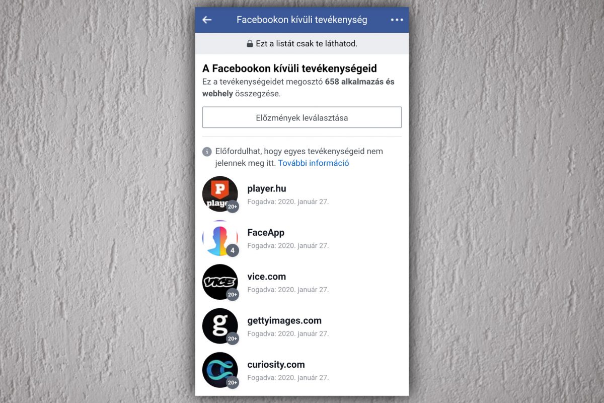 A Facebook kedden tette elérhetővé mindenki számára a "Facebookon kívüli tevékenységek" opciót, amit a linkre kattintva vagy az oldalra belépve a Menü->Beállítások és adatvédelem->Beállítások->Facebookon kívüli tevékenységek úton érhetünk el. Előre szólunk, megdöbbentő mennyiségű adatról van szó, hiszen a listában megtalálható az összes olyan oldal, ami adatot szolgáltat rólunk a Facebooknak.