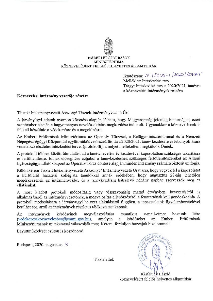 Az Emberi Erőforrások Minisztériuma által küldött intézkedési tervet a Pedagógusok Szakszervezete a Facebook oldalán tette közzé. Az intézkedési tervet kísérő levélben a Minisztérium a járványügyi adatok nyomon követése alapján Magyarországot jelenleg biztonságosnak tartja, és ezért „szeptemberben a hagyományos nevelés-oktatás megkezdése indokolt” szerintük. Mindez viszont csak úgy történhet, ha a köznevelés is felkészül – a 11 pontos intézkedési terv pedig épp ezt a célt szolgálja.