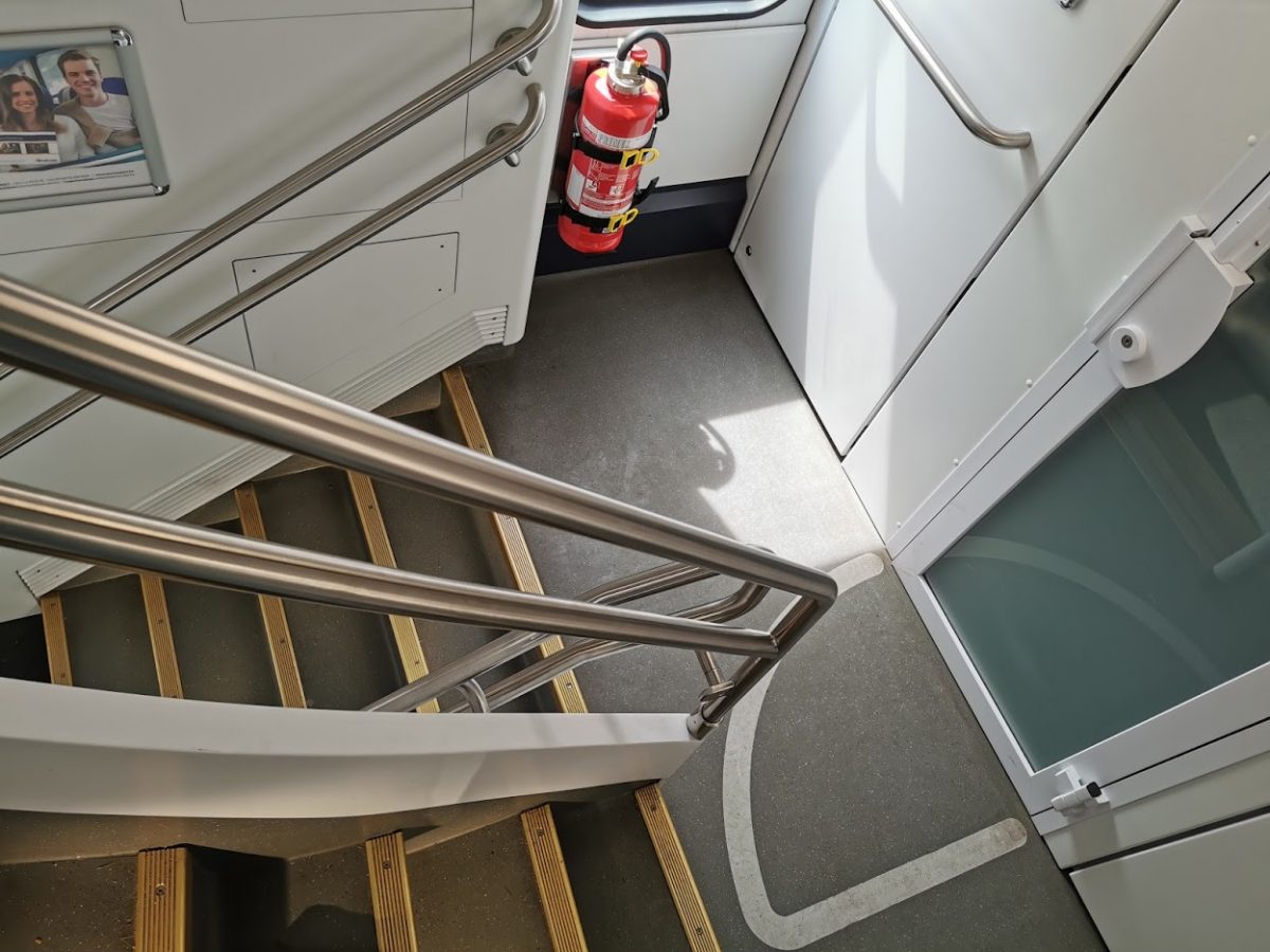 Miután a Nyugatiban az erre kialakított konténerekben megvásároltuk a jegyeket, rögtön a peronra siettünk, ahol ott tornyosult a jármű. Valójában a KISS kívülről nem tűnik olyan magasnak, ez inkább belül érződik, illetve ott is csak a sínpálya egy pontján, de erre még visszatérünk. Miután beléptünk, feliramodtunk az emeletre, ami olyan szűk lépcsősoron volt lehetséges, mint ami a hajókon is van, külön kiemelendő az odakészített porral oltó készülék.