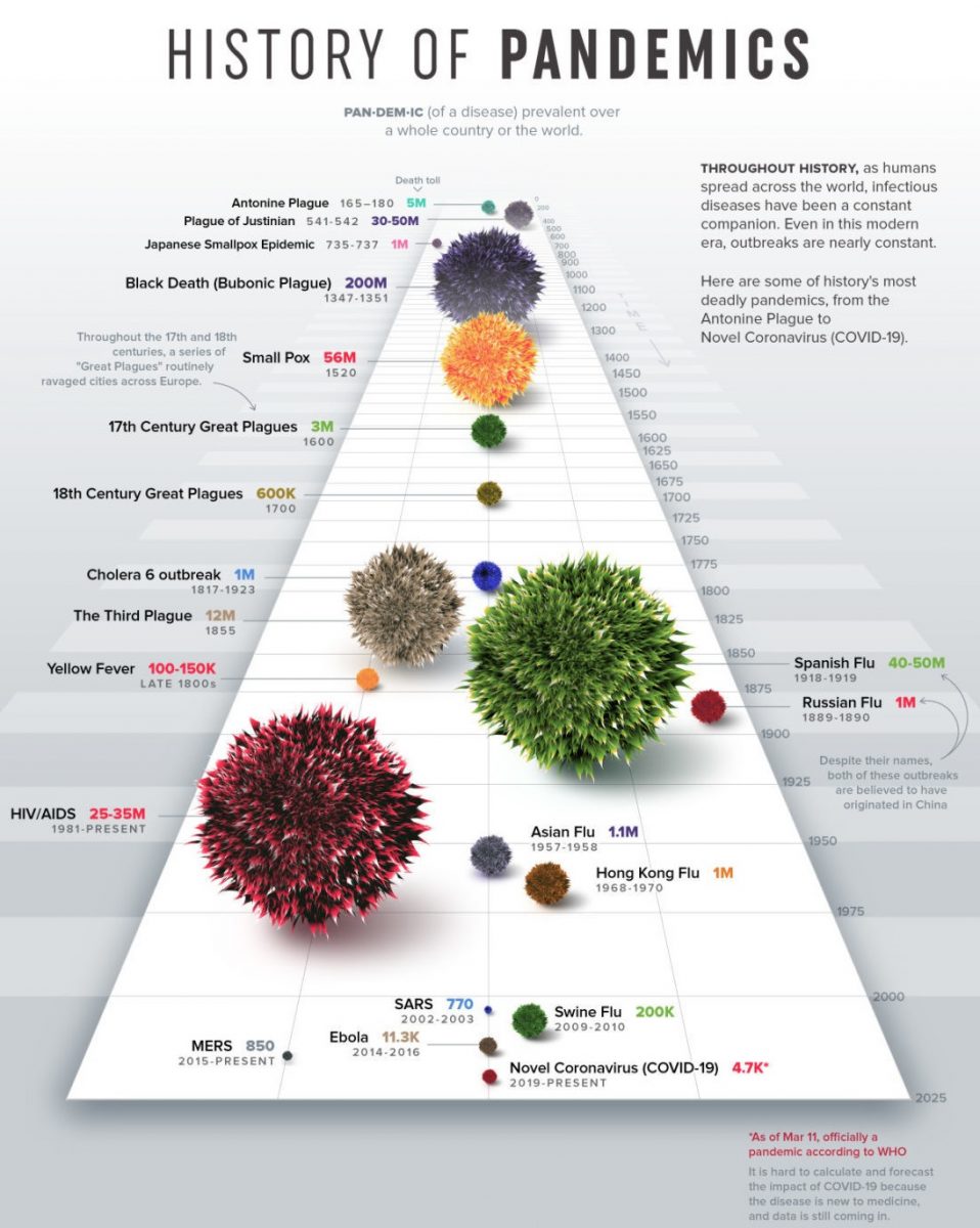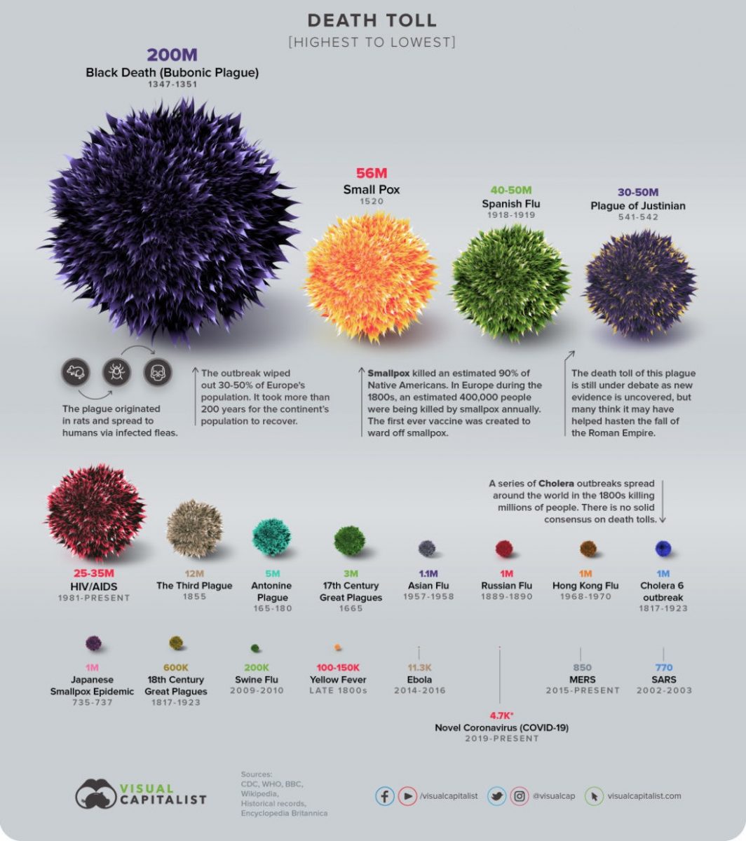 Mivel folyamatban lévő járványról van szó, aminek a kiterjedése és a súlyossága is nagyban függ attól, hogy az országok hogyan reagálnak rá, ezért természetesen egyelőre nem lehet objektíven összehasonlítani a Covid-19-et a korábbi járványokkal, a World Economic Forumon közölt infografika tehát ebből a szempontból inkább egy érdekességnek tekinthető.