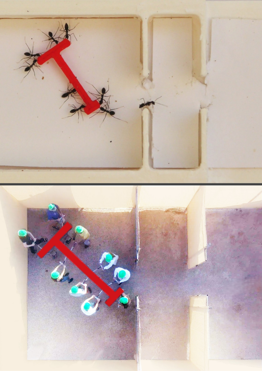 A probléma, amit a kísérletben meg kellett oldani az embereknek és az őrült hangyáknak is, egy T-alakú tárgy átjuttatása volt két átjárón keresztül egy labirintusszerű területen, úgy, hogy közben a csapatnak együtt kellett rájönnie, hogyan lehet hatékonyan szállítani az objektumot. A kísérlet több részből állt: volt olyan felállás, ahol egyedül kellett kivitelezni egy-egy embernek, illetve hangyának a feladatot, volt, amikor kisebb csoportokban dolgoztak együtt, és volt, amikor nagyobb csoport, több mint 20 ember, illetve több mint 20 hangya cipelte a tárgyat.