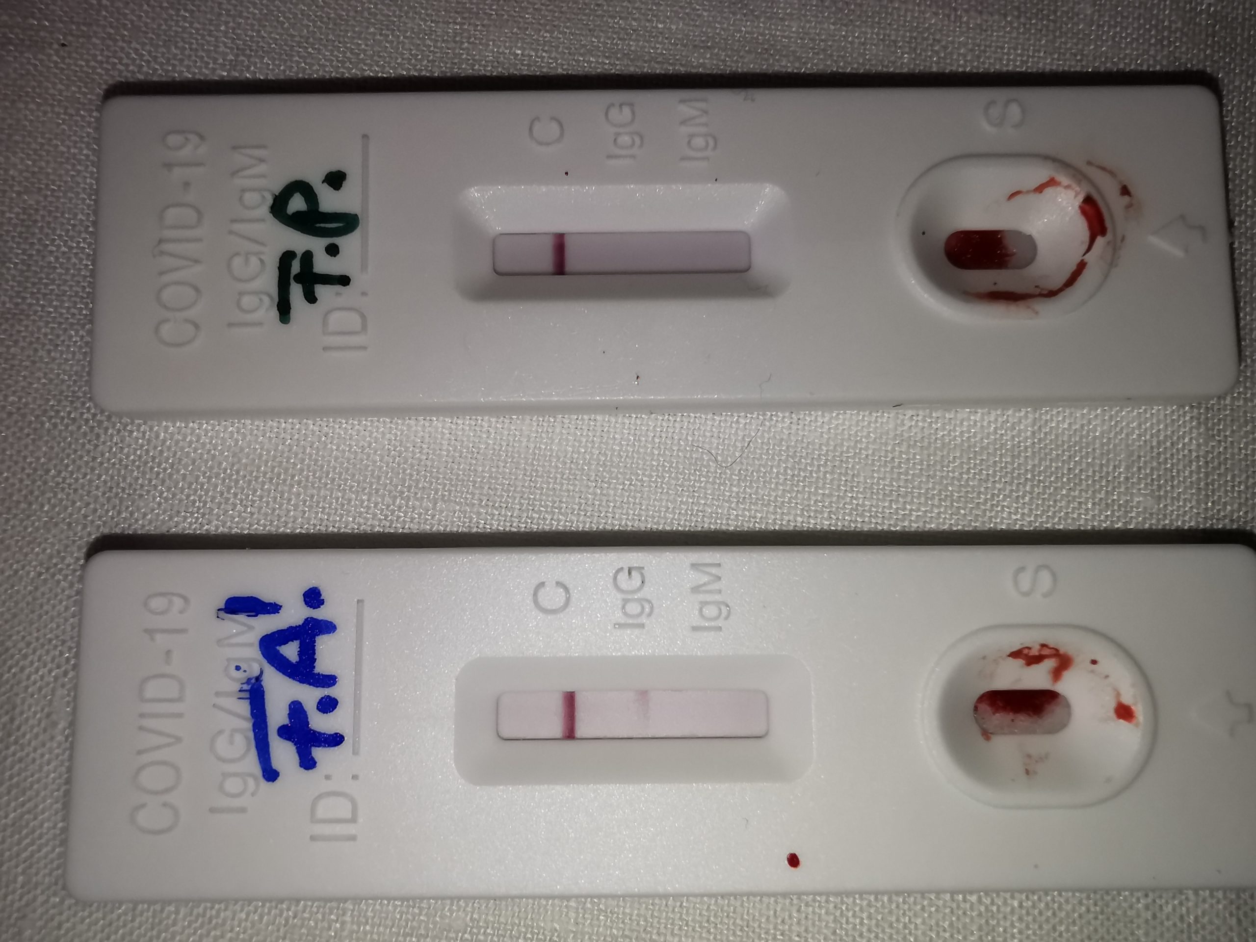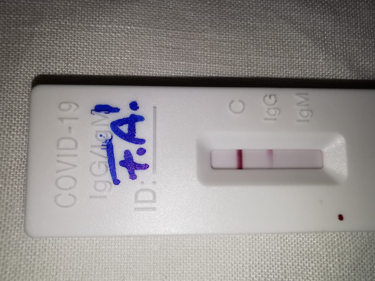 A tesztet tehát rajtam végeztük, és én átestem a betegségen. Összehasonlításképp leteszteltünk egy másik személyt is, aki tudomásunk szerint nem kapta el a vírust. Az én tesztemen elég gyorsan, talán öt perc alatt feltűnt egy halvány csíkocska az antitestet észlelő IgG-felirat mellett. A másik teszten a csík a papírformának megfelelően nem jelent meg sem az IgG, sem az IgM sávján.