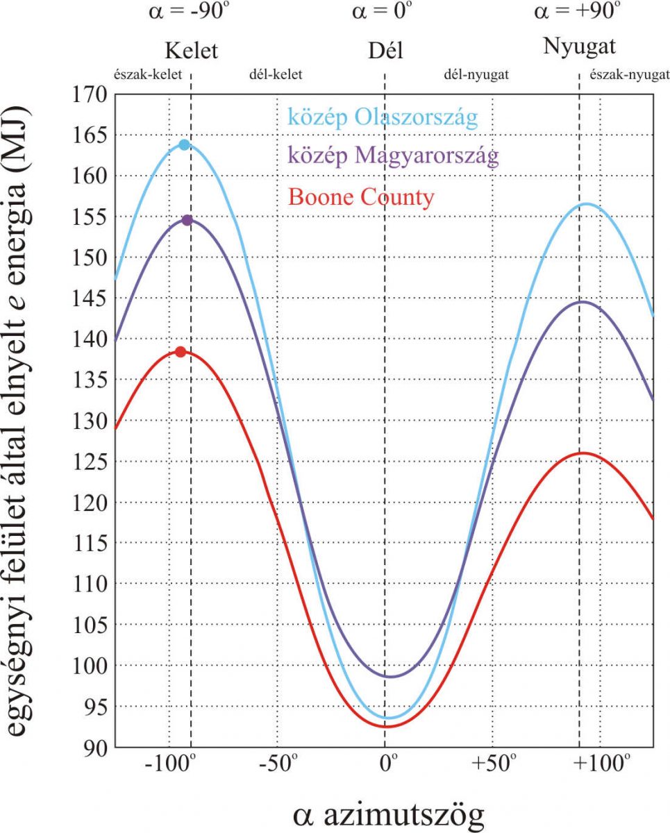 A napraforgóvirágzat maximális fényenergiát α = ‒94° azimutszögnél nyel el (2. ábra), ami majdnem megegyezik a keleti iránnyal (αkelet = ‒90°). A virágzat e(α) energiafüggvényének másodlagos maximuma α = +92° azimutnál van, ami közel azonos a nyugati iránnyal (αnyugat = +90°). e(α) minimuma α = +1° azimutnál van, ami gyakorlatilag egybeesik a déli iránnyal (αdél = 0°). Egy kelet felé néző virágzat 1.1-szer és 1.5-szer több fényenergiát nyel el, mint egy nyugatra, illetve délre néző. Ezzel szemben, egy dél helyett nyugat felé néző virágzat 1.36-szor több energiát nyel el (2. ábra). Mivel a napraforgófej fotoszintetizáló zöld háta akkor nyeli el a legtöbb fényenergiát, amikor a virágzat nyugatra néz, a zöld fejhát által elnyelt fényenergia maximalizálása nem magyarázhatná a virágzat keletre nézését.