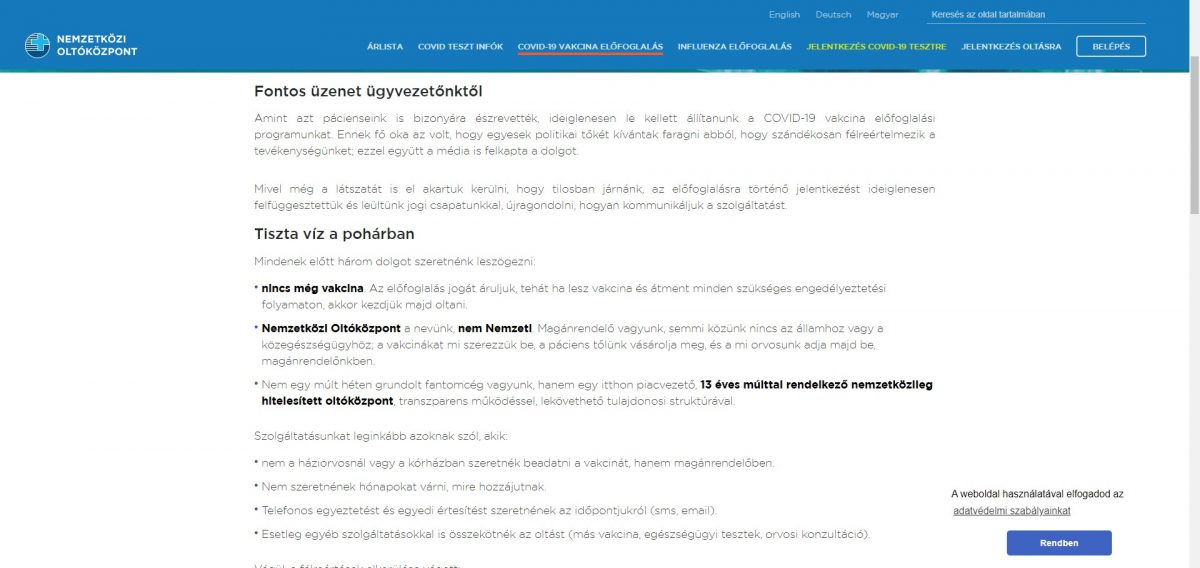 Az Átlátszó írt arról, hogy az oltokozpont.hu oldalon már elő lehet rendelni a Covid19 járványt okozó koronavírus elleni vakcinát. Idővel az előfoglalási oldalt levették. A lap kérdésre a tulajdonos elárulta, hogy csak átmenetileg vették le az oldalt, mert finomítanak a részleteken. Ez így is történt, ennek a cikknek az írásakor az oldal ismét elérhetővé vált.