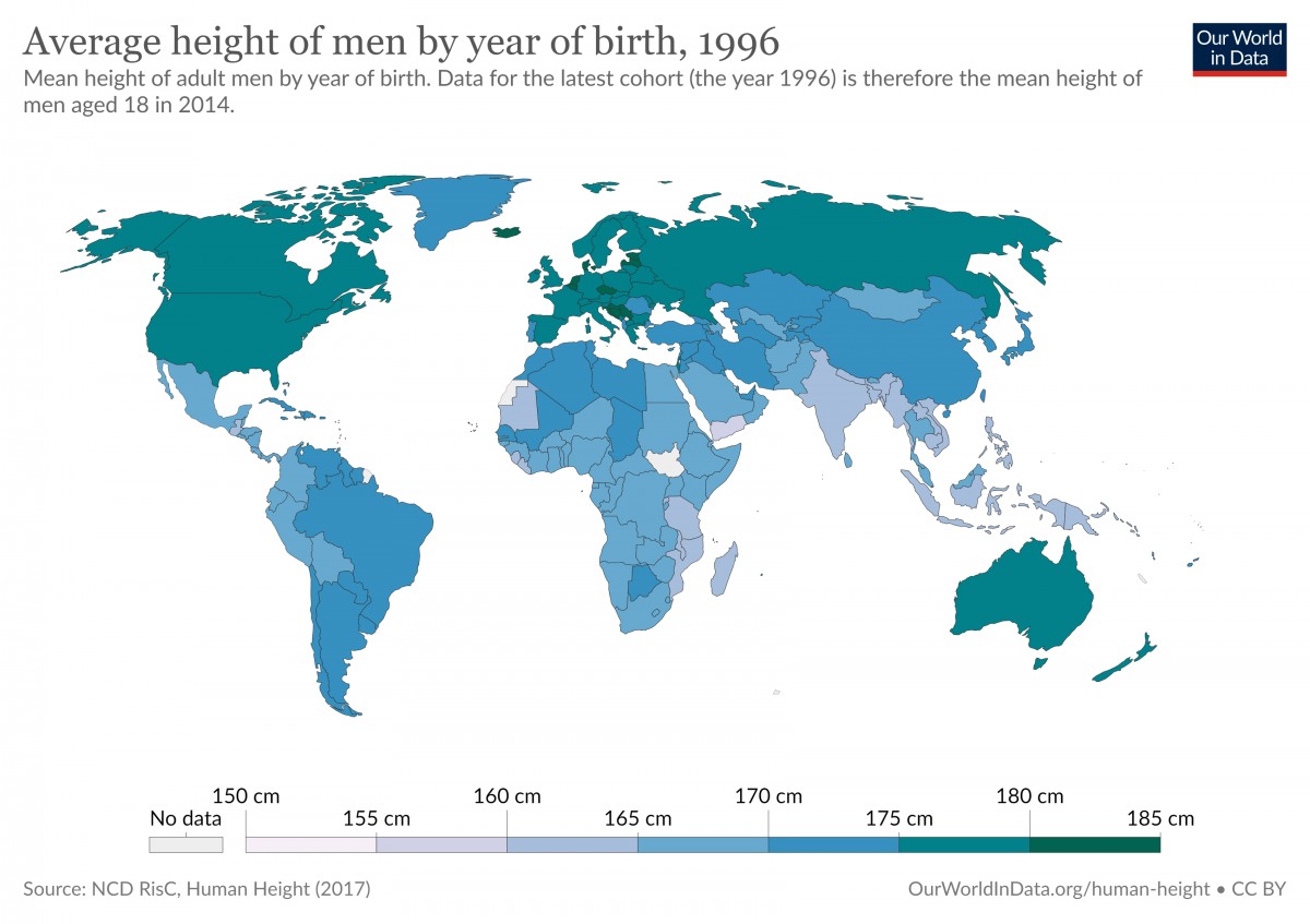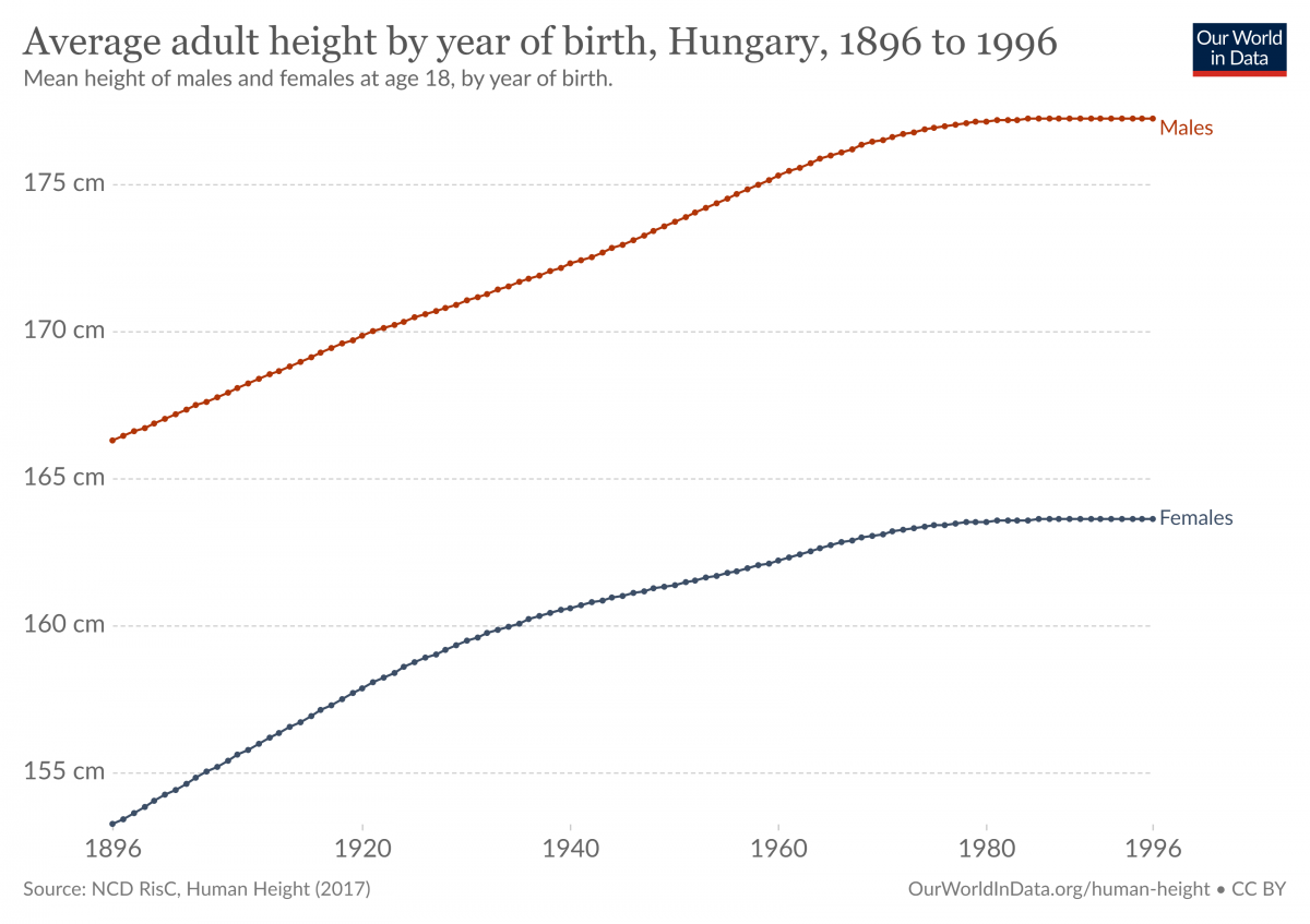 Világviszonylatban nézve a növekedés az egész Földön elképesztő ütemet diktált, hiszen amíg az 1896-ban született férfiak még csak átlagosan 162 centiméter magasra nőttek, az 1996-ban születettek átlagos magassága már 171 centiméter volt. A magyarok ebből a szempontból valamivel a világátlag fölött állnak, hiszen a legújabb adatok szerint nálunk a férfiak átlagos magassága 177 centiméter, míg a nőké 164 centiméter körül van.