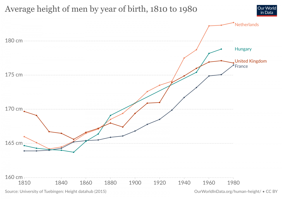 Az 1850-es években Európa férfi lakosságának az átlagos testmagassága még mindig csak 165 centiméter volt. A táplálkozás szerepét jól jelzi az a John Komlos, a Müncheni Egyetem professzora által készített tanulmány, amely kimutatta, hogy ebben az időben a brit Sandhurts katonai akadémia kadétjai, akik jellemzően a felsőbb osztályokból származtak, átlagban 22 centiméterrel voltak magasabbak a Marine Society kadétjainál, ahol az alsóbb rétegből származókat oktatták.